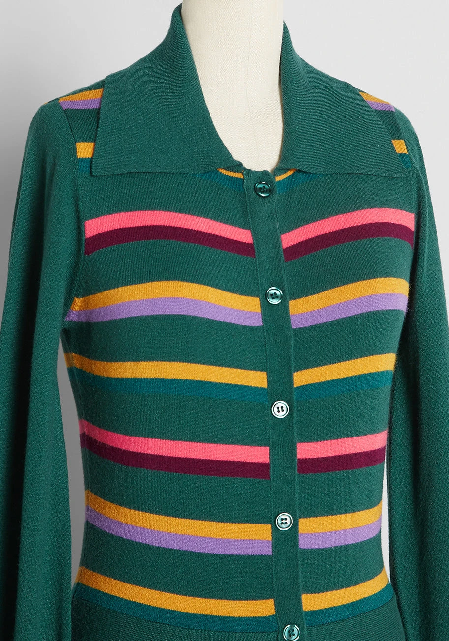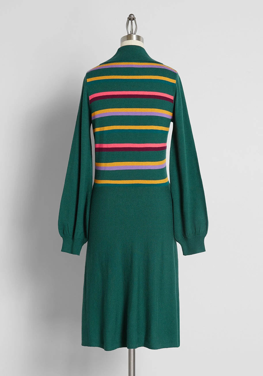 Made from a super soft knit in an emerald green hue, this 1970s-inspired sweater dress from our ModCloth label is the perfect addition to any retro-loving wardrobe. Featuring bold stripes in hues of pink, burgundy red, golden yellow, and lavender purple at the bodice, along with a full button-up front closure, this collared knit dress is ready for the colder weather. With long blouson sleeves and a straight silhouette with a slightly flared skirt, this sweater dress is ready to elevate your knitwear game in a multitude of ways.