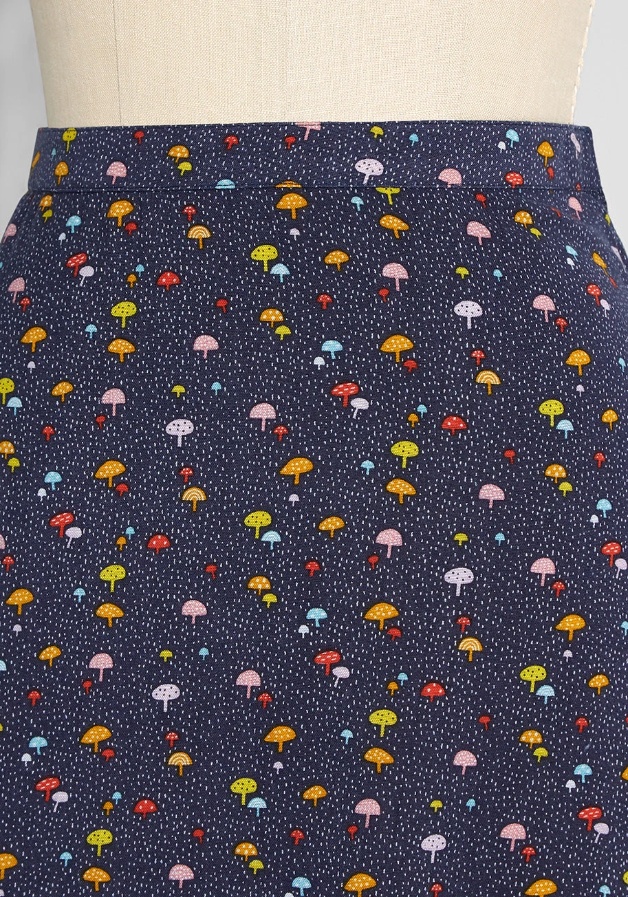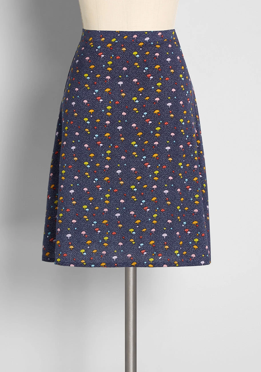 So retro-inspired, this navy blue A-line skirt from Irish brand Circus is causing quite the commotion thanks to its darling ditsy print made up of white micro-dots and tiny mushrooms sprouting in shades of yellow, red, white, pink, orange, and blue. Made from a lightweight woven material, this knee-length skirt boasts a stylish high-rise waist and an effortless, drapey silhouette.