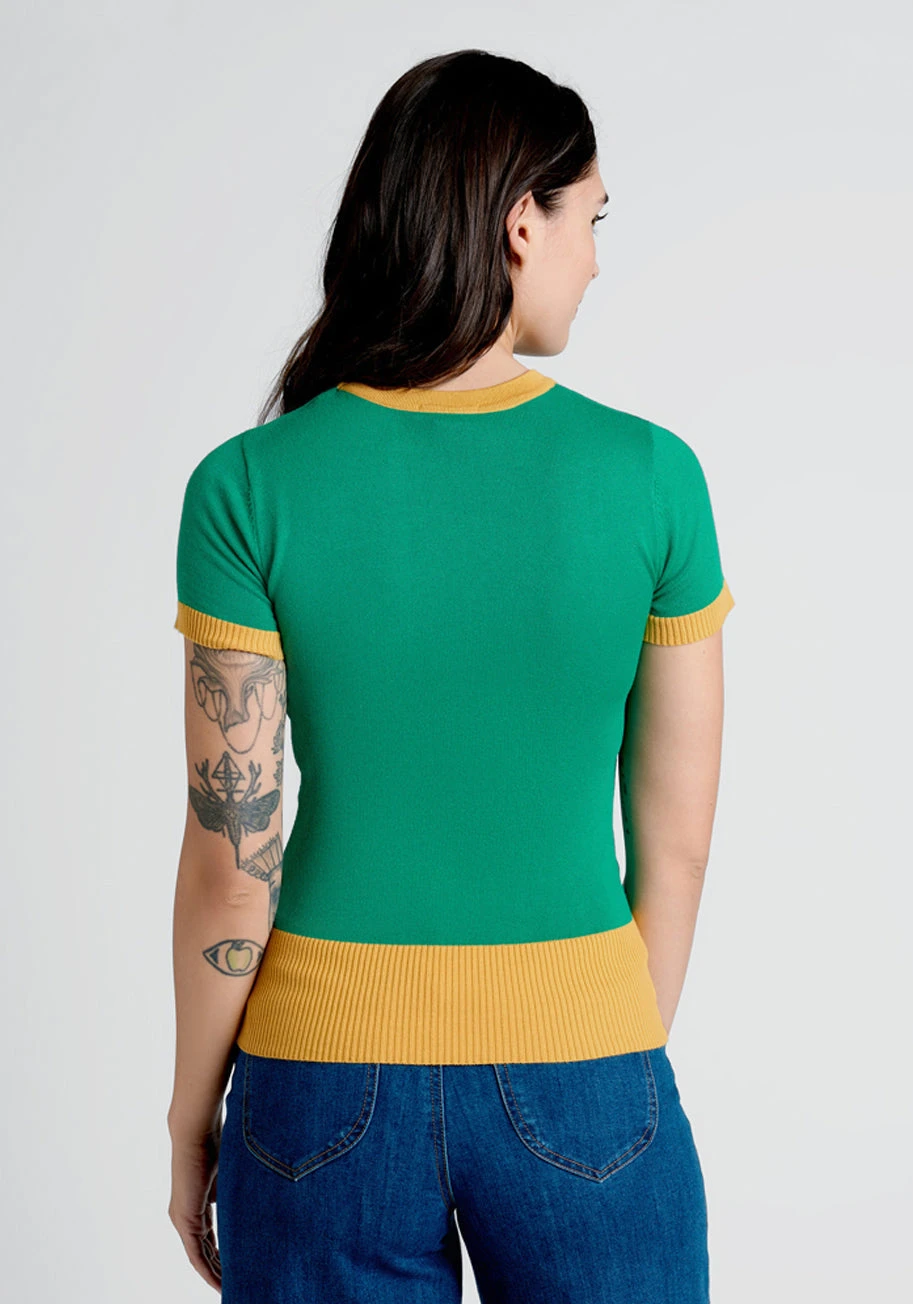 Say hello to this retro-inspired knit top from UK brand Bright and Beautiful! Made from a viscose-blend knit, this short sleeve green sweater boasts stripe detailing at the front in shades of yellow, blue, teal, and white beneath groovy green bubble letters that read, “Mellow.” So 70’s-inspired and truly unique, this causal knit tee boasts short sleeves and yellow ribbed-knit detailing at the crew neck, cuffs, and wide hemline.