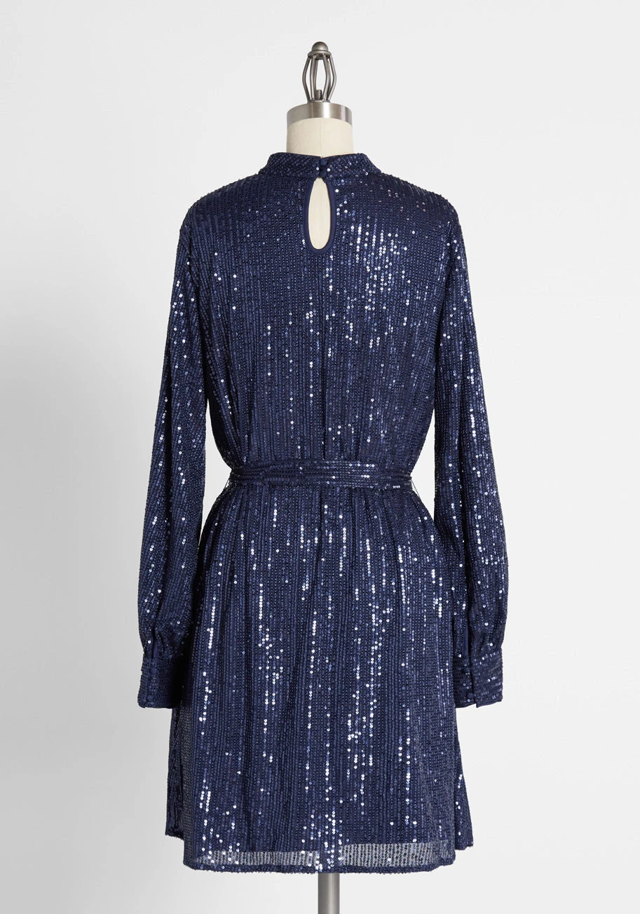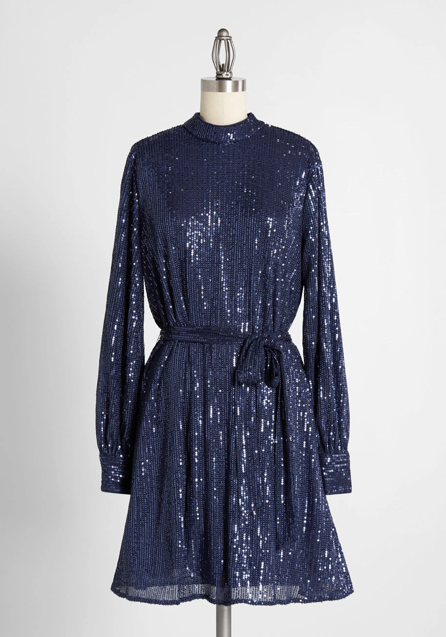 This sequin number from Chi Chi London is beyond chic and perfect for dressing up for yourself this New Year’s Eve. 1970s-inspired and ultra-flattering, this fully lined mini is made from a navy blue sequin fabric. This dress features long blouson sleeves, a mock neck with a rear keyhole with button-loop closure, sash tie at the waist and endless amounts of glitz. Even if you choose to spend NYE in your PJs, this frock is so classic and versatile, once things are better again, this will be the perfect dress to toast to the occasion in!