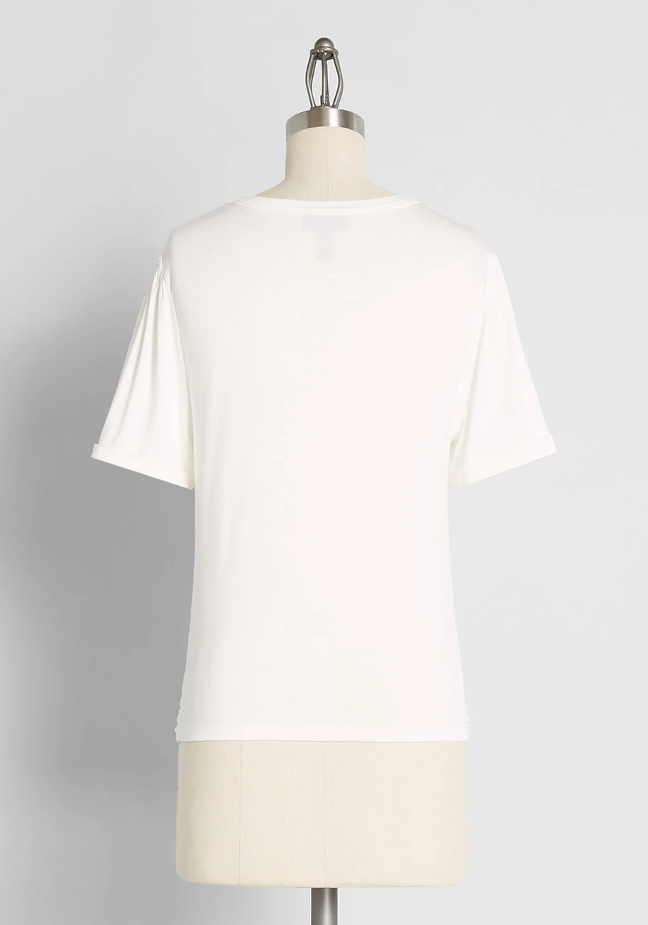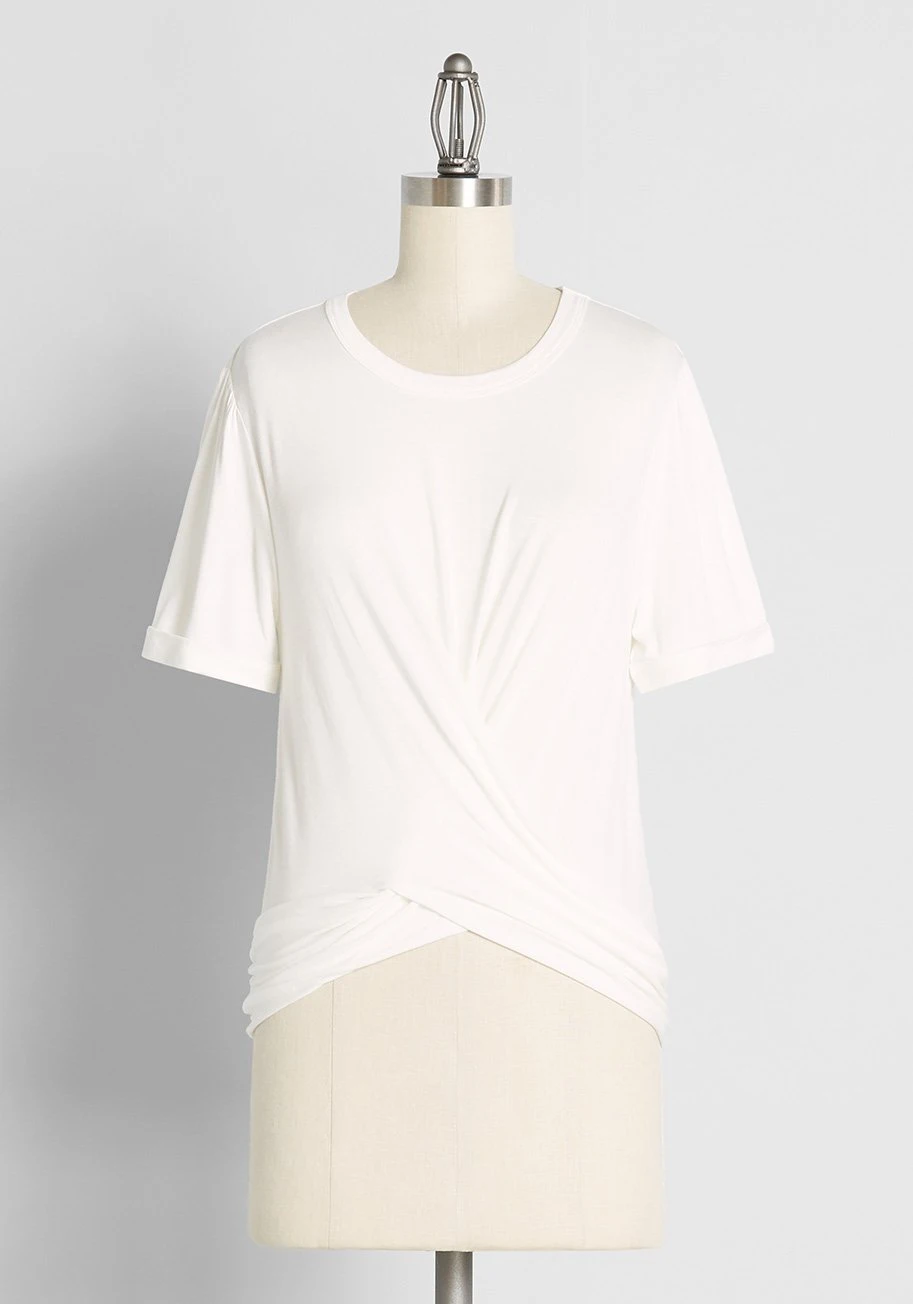We all need a little sprucing up in our knitwear department, and what better way to refresh yours than with this white short sleeve top from our ModCloth namesake label. Made from a super soft, stretchy knit, this tee features a chic gathered twist-knot detail at the front hem, making this an elevated basic that can be styled and layered in a multitude of ways. So versatile and effortlessly stylish, this crew neck knit top will surely become one of your favorite go-to pieces.