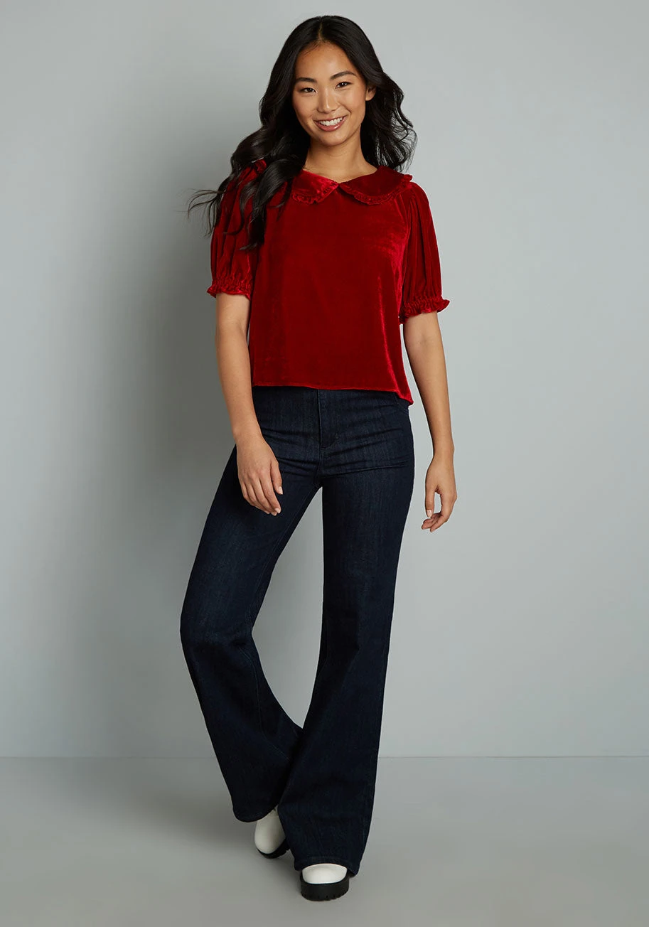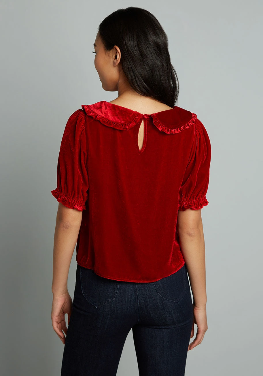 With a warm glowy sheen, this festive red velvet top from our ModCloth namesake label is full of holiday cheer. Boasting a subtly cropped, boxy silhouette, this vintage-inspired top features a ruffled Peter pan collar with keyhole and button-loop closure at the back and adorable puff sleeves with elasticized ruffle cuffs.