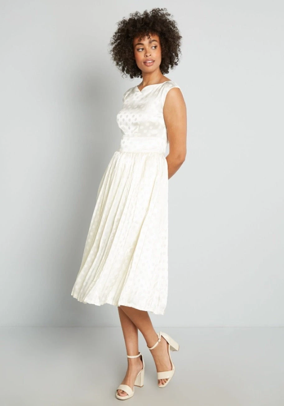 For the vintage bride at heart, your wedding day ensemble beacons to the charms of a bygone era with this white fit and flare dress by our ModCloth namesake label. Made of a polka dot jacquard in a lux satin finish, this fully-lined, sleeveless dress features a bateau neckline, pleated skirt, and side pockets. Style your wedding day ensemble with 50s-inspired pumps and a pill-box fascinator.