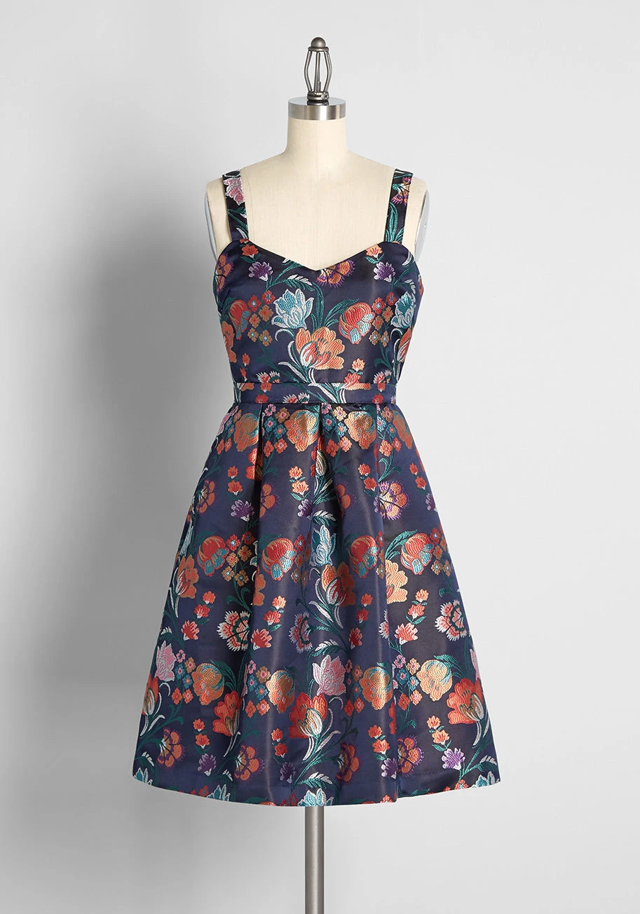 You’re simply enchanting in the vintage-inspired, exclusive floral print of this navy blue fit-and-flare dress from our ModCloth namesake label. Made from a luxe brocade, this striking A-line dress boasts an all over pattern of gorgeously ornate flowers in shades of blue, red, orange, pink, golden yellow, silvery white, and purple that are surrounded by wispy emerald green leaves. Featuring a sweetheart neckline, this sleeveless mini has a stylish high-rise waist and perky box pleats throughout that create just the right amount of fullness in the darling flare skirt.