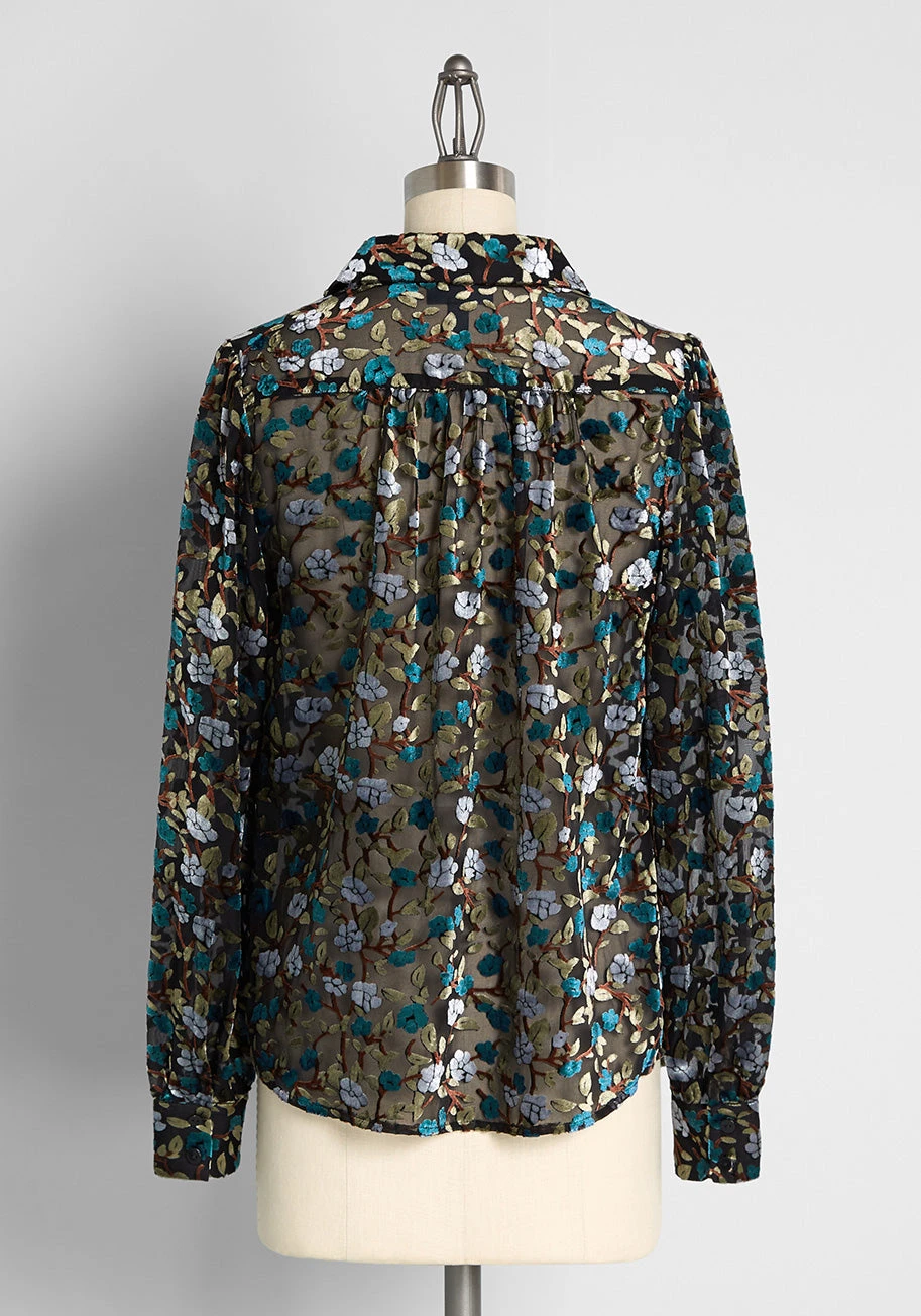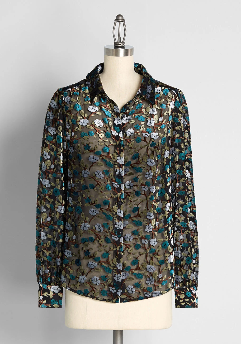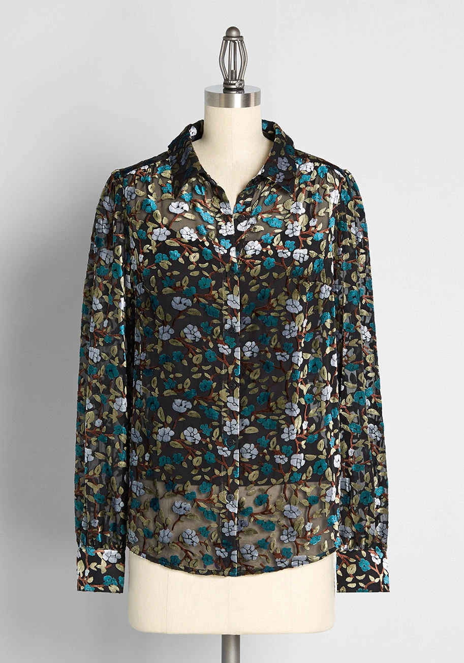 Word on the street is you’re savvy in timeless style, and as you step out having fashioned this luxe, black burnout velvet top, you prove every rumor to be true! Part of our ModCloth namesake label, this button-up showcases a floral print in a moody color scheme of grey, teal blue, olive green and brown! Featuring buttoned cuffs at the long sleeves, subtle shirring at the back yoke, and a hint of vintage inspiration that’s still very sharp today, this retro top is as stylish as ever.