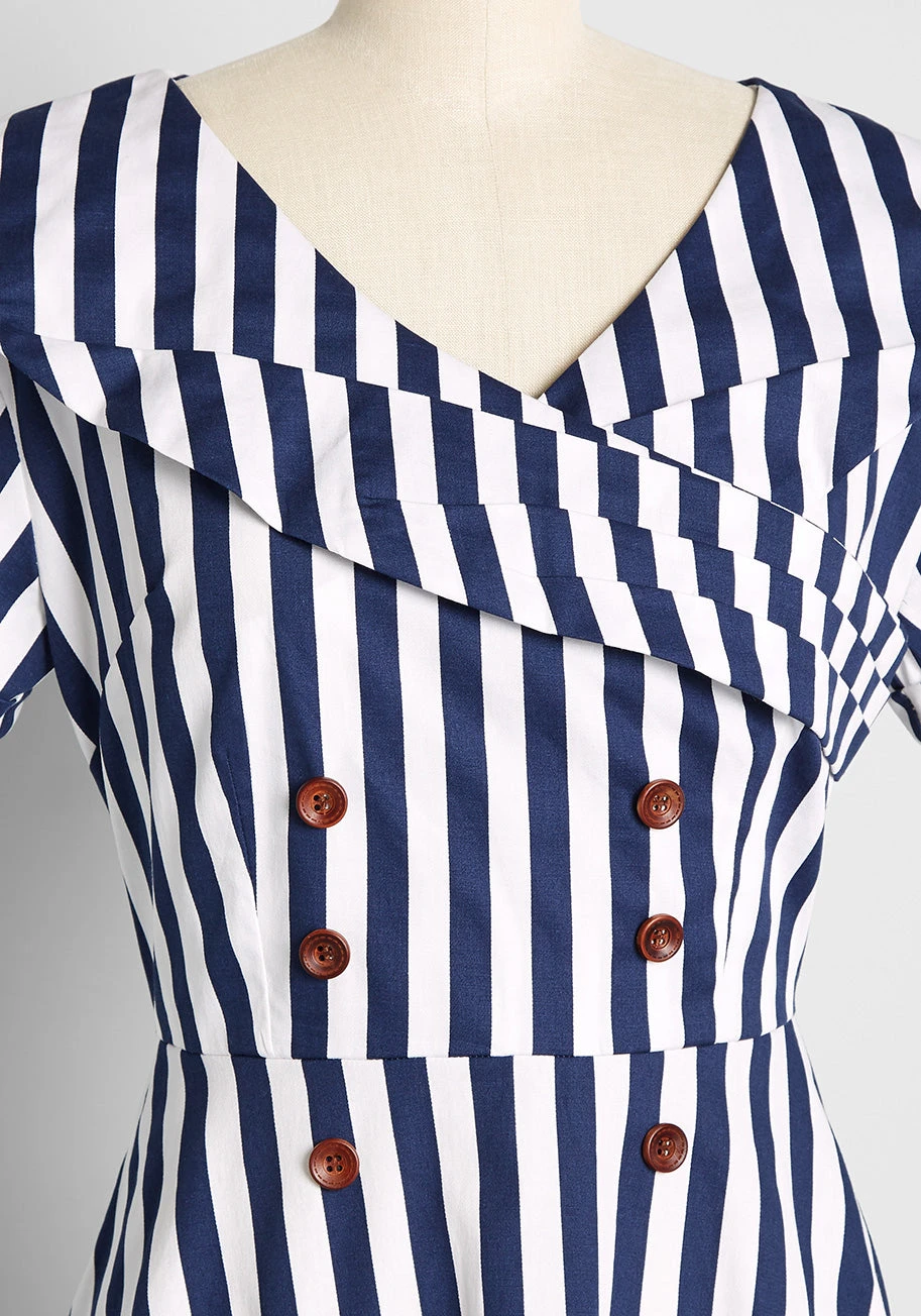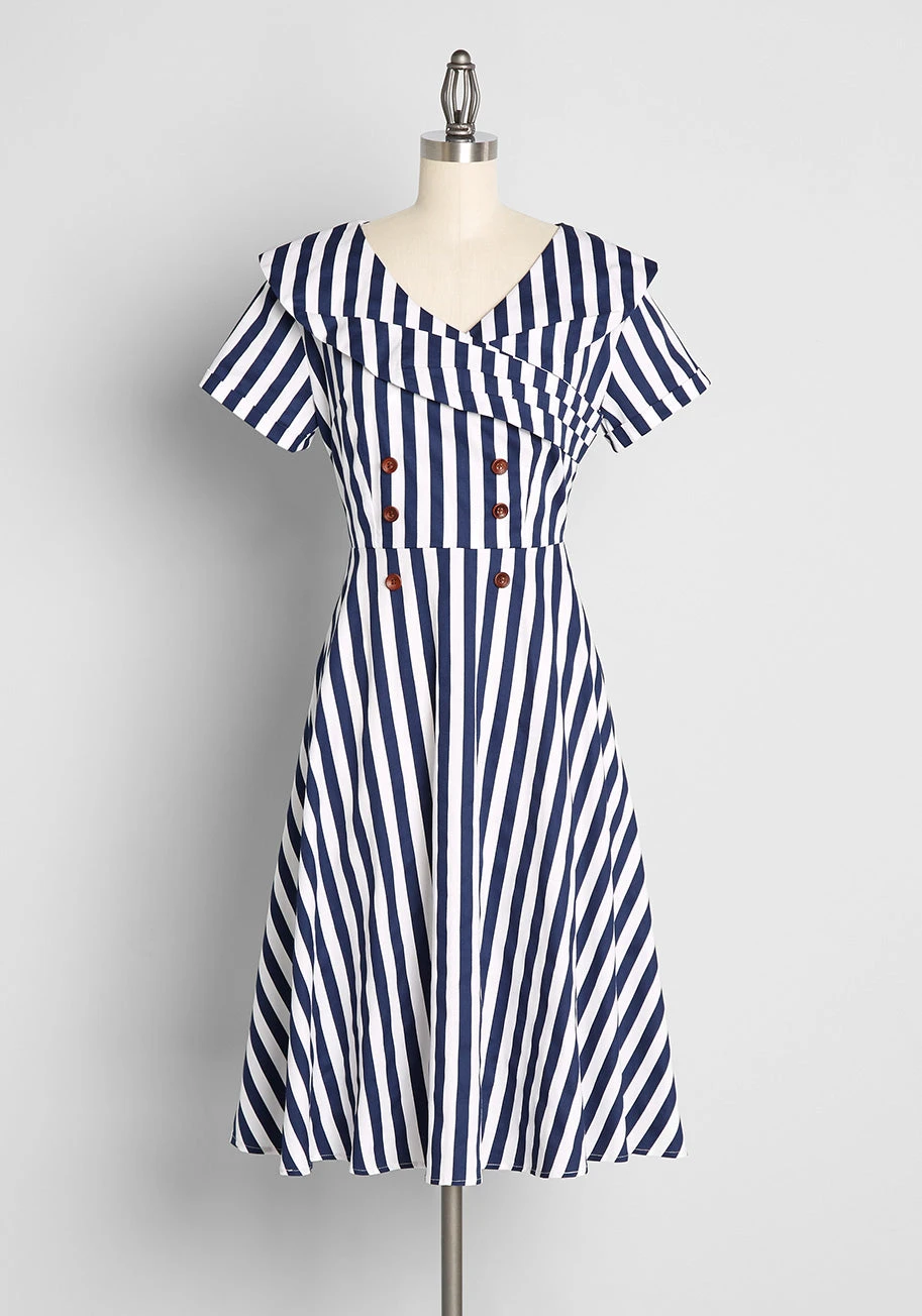 Take nautical up a notch in this 1950’s-inspired navy blue and white striped swing dress from UK brand Royal Monk! Made from a stretchy woven fabric, this A-line dress boasts short sleeves, a sailor-inspired collar with unique wrapped detailing, decorative button detailing at the front, and a darling mid-length swing skirt.