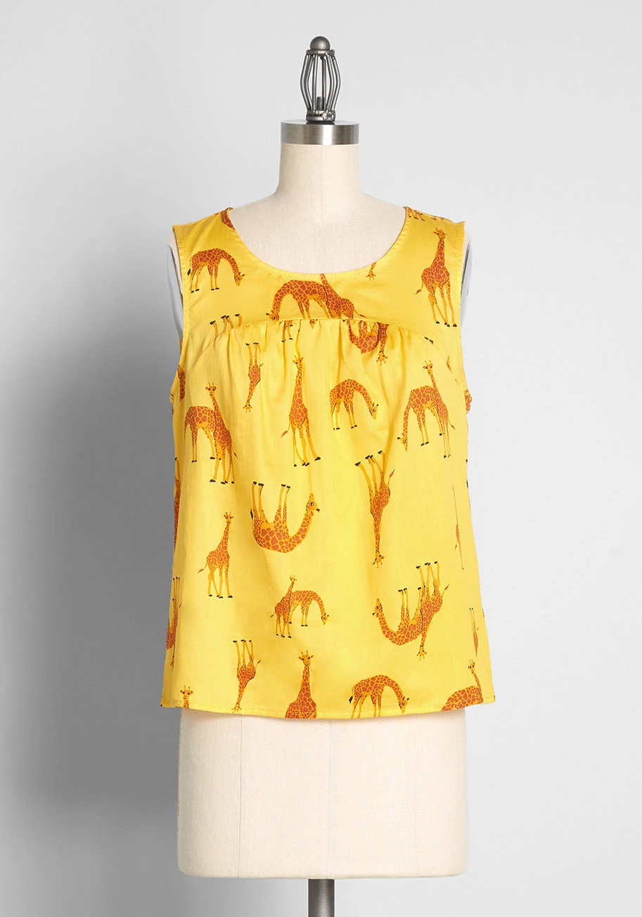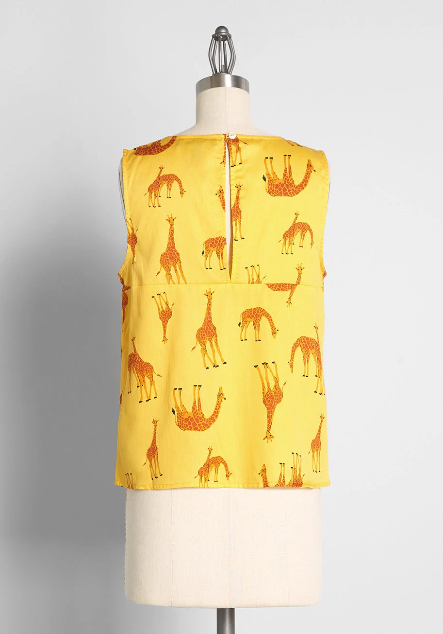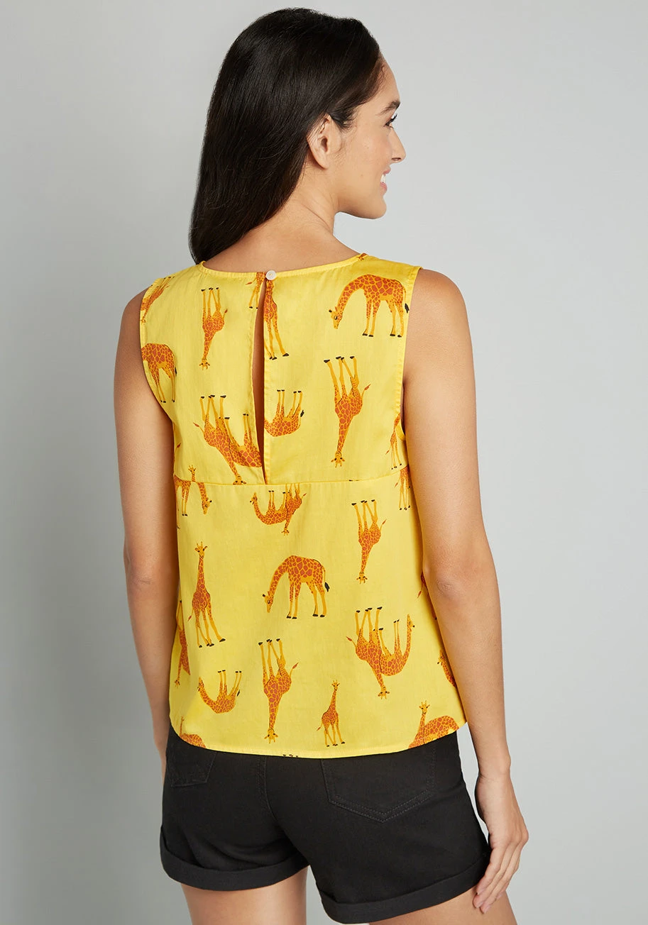Get outside and let your beaming smile outshine the sun in this retro-fab, lightweight sleeveless top, sporting a hand-drawn print of a delightful family of orange-hued giraffes grazing peacefully atop a brilliant sunshine yellow background throughout. Boasting a round neckline with a keyhole and button-loop closure at the back and a uniquely curved yoke design with thoughtfully placed darts at the front that creates a breezy vintage-inspired silhouette that will keep you feeling cool while you soak up all that summer has to offer.