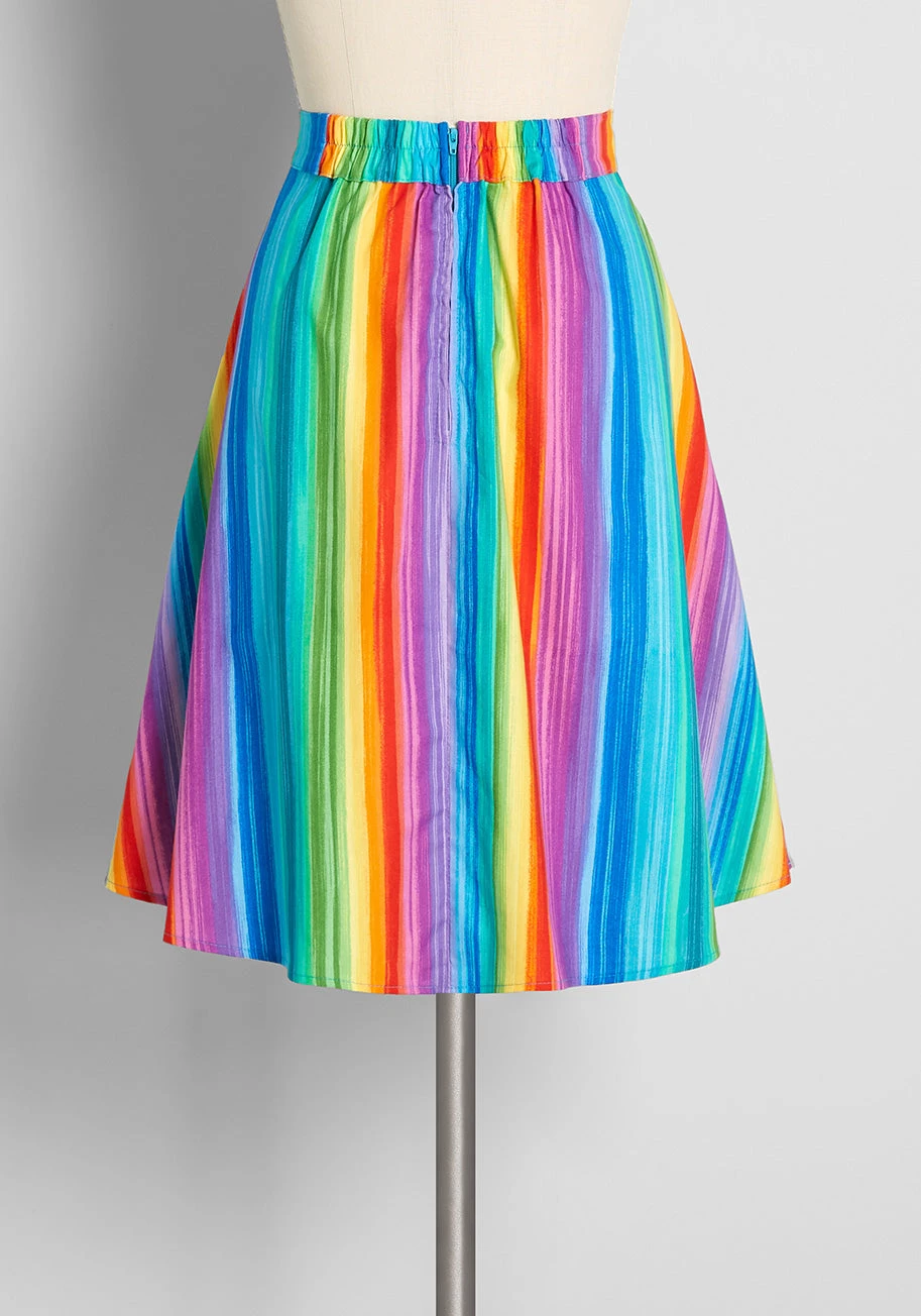 In a bold rainbow-striped print, made up of exceptionally vibrant hues, this outstanding swing skirt from Retrolicious is blazing with personality and style. Boasting a high-rise waistline with an elasticized panel at the back for ease of fit, this vintage-inspired A-line skirt with handy side pockets is such a unique piece to add to your collection.