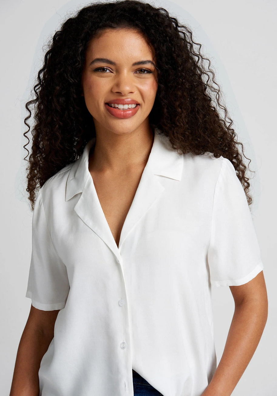 Rock out in clean-cut 1960s style this spring in our new camp collar shirt. Made from a soft and drapey woven challis fabric in crisp white, this button-up blouse boasts subtle shirring at the short sleeves, a signature camp collar, boxy cut, and an easy fit. This ModCloth namesake label top is an ideal vintage-inspired separate to add to your wardrobe as it is timeless, versatile, and most of all – fun!
