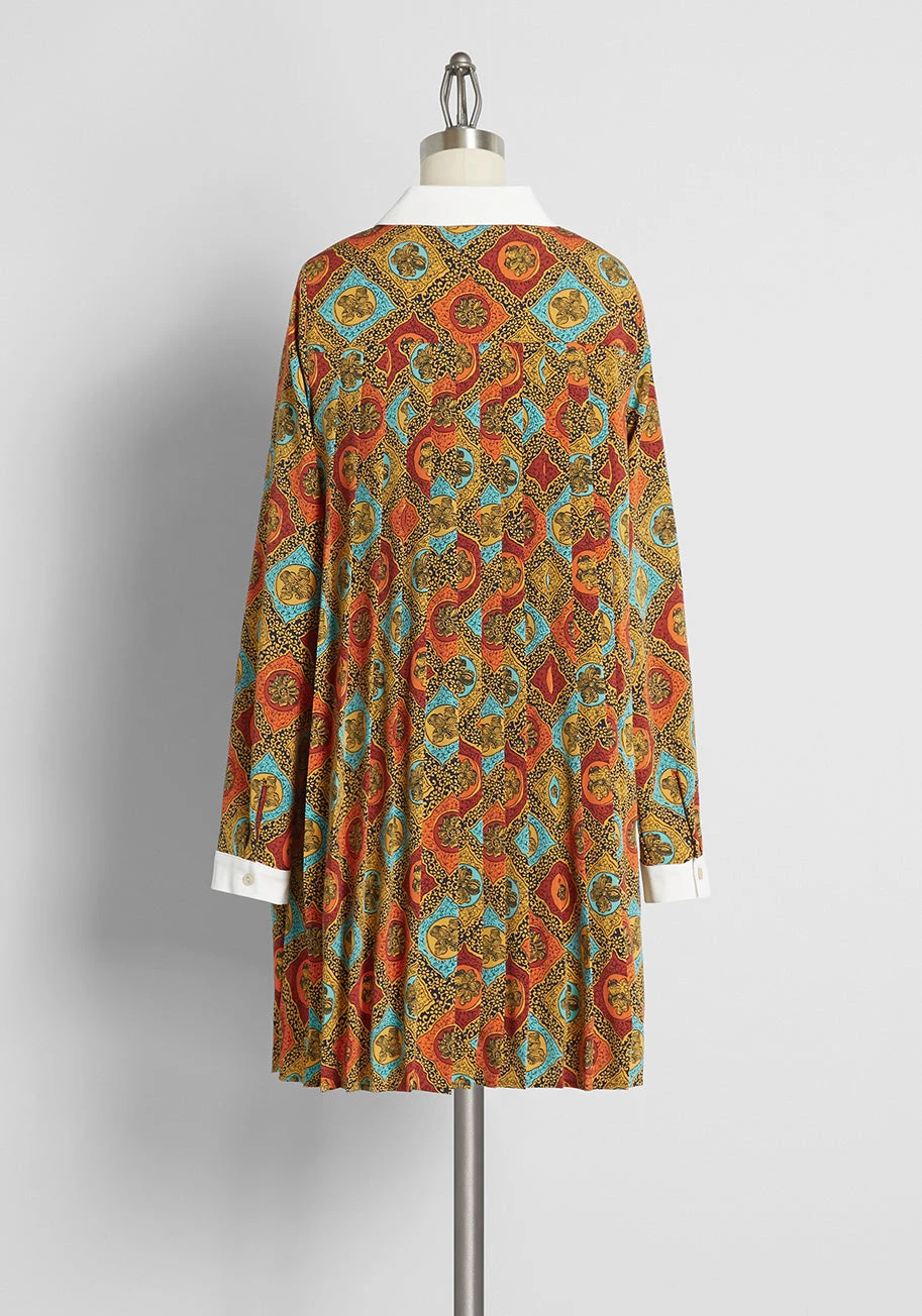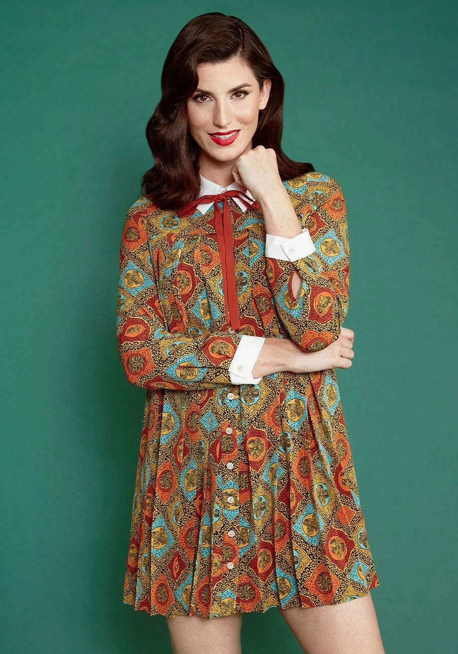 This vintage-inspired mini dress from our ModCloth namesake label is so fantastical, it is as if it popped out straight from a storybook. With a bold, multicolor checkered motif atop a black background that is boasted all over the pattern and highlighted by drawings of woodcut flowers throughout, this 1940s-inspired shift dress features thoughtfully placed accordion pleats throughout, adding even more drama. Its striking white cuffs at the long sleeves and a point collar with a pumpkin spice orange-hued ribbon tie-neck and button-up front puts a spotlight on the subtle shirt design elements of this dress that are sure to make it a classic piece in anyone’s quirky and colorful wardrobe!
