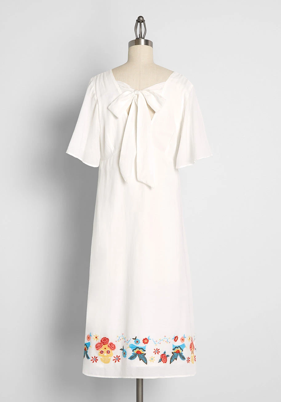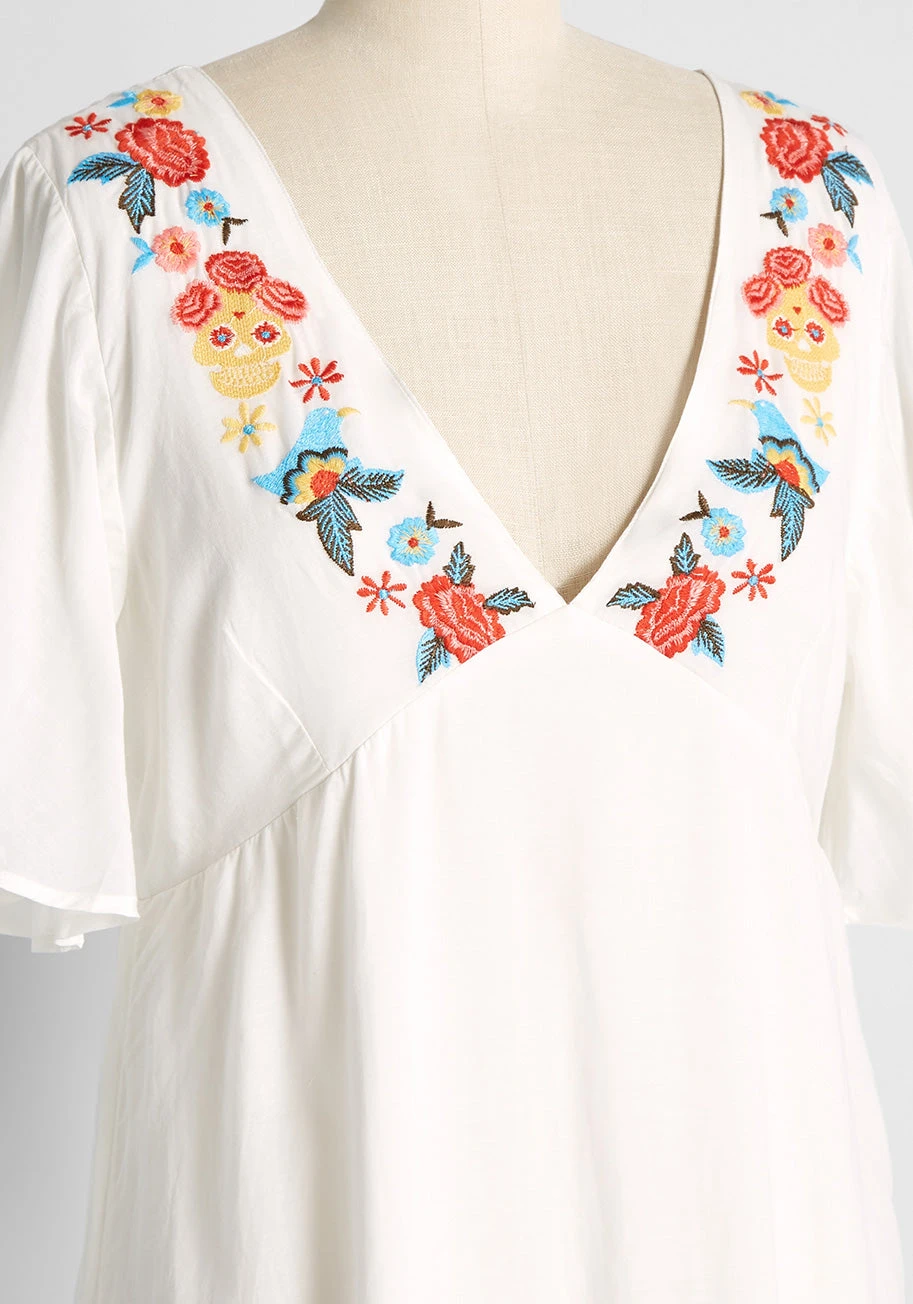 You’ll be the perfect combination of sweet-yet-spooky in this gorgeous ivory dress from our ModCloth namesake label. Made from a lightweight cotton-viscose blend fabric, this vintage-inspired frock features short flutter sleeves, a V-neckline with tie-bow closure at the back, subtle shirring at the bust, and a retro-chic relaxed silhouette that you’re going to love. The real magic of this dress, however, comes from the embroidered detailing of the collar and hemline that boasts blue birds and yellow candy skulls nestled amidst a variety of flowers in shades of red and pink.