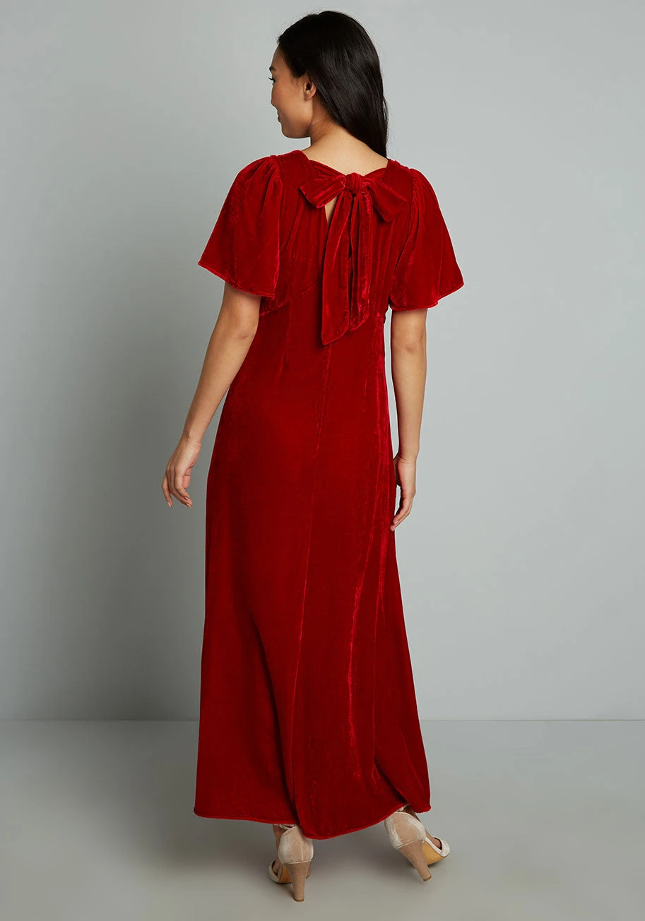 Time stands still when you cross the room in this elegant, shimmering red velvet maxi dress from our ModCloth namesake. Made from an indulgent, crimson red velvet fabric with a subtle ribbed texture for a glowy finish, this drapey red gown boasts short flutter sleeves, a plunging V-neckline with chunky tie-bow closure at the back, a semi-fitted bodice with flattering princess seams, and a beautifully flowing maxi skirt. Equally effective for a formal holiday gathering or an intimate dinner party, this vintage-inspired red velvet gown is an effortless showstopper.