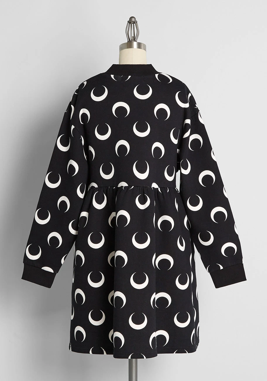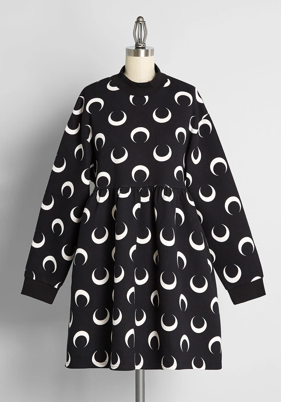 Fit for wearing out with platform lace-up boots or laying back in bed dreaming of many moons, galaxies, and shooting stars, this black sweatshirt dress from Aussie brand Black Friday is exactly what your wardrobe needs for the cooler months ahead. Made from a super soft and cozy cotton-blend fleece, this long sleeve babydoll dress is emblazoned all over with white crescent moon motifs, giving it an edge that takes your fall style to the next level. A rib-knit mock neck, side pockets, and a relaxed fit keeps this cuddly mini dress chic and ultra-versatile.