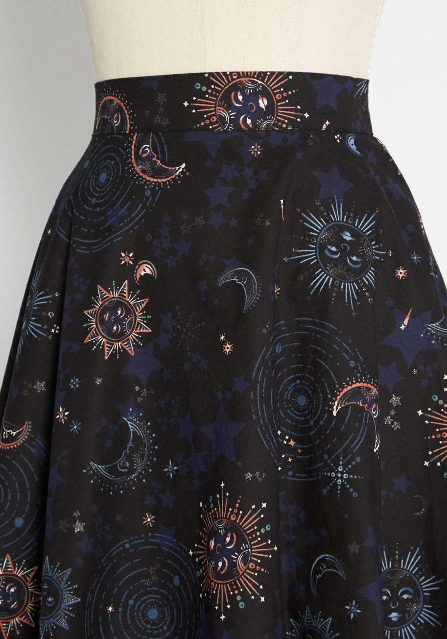 The black of night is brilliantly offset by the swirling cosmic illumination of the serene sun and the mystical moon in shades of blue, orange and purple with this vintage-inspired cotton skater skirt. Exclusive to ModCloth, and bespeckled with deep blue stars, this beautiful swing skirt by Retrolicious is astronomically awesome.