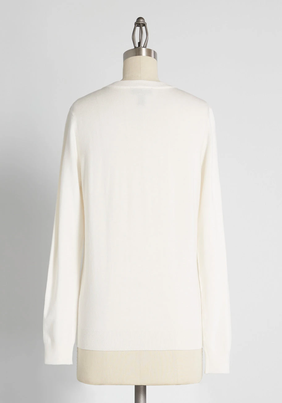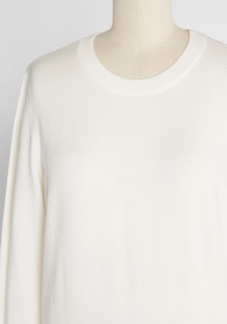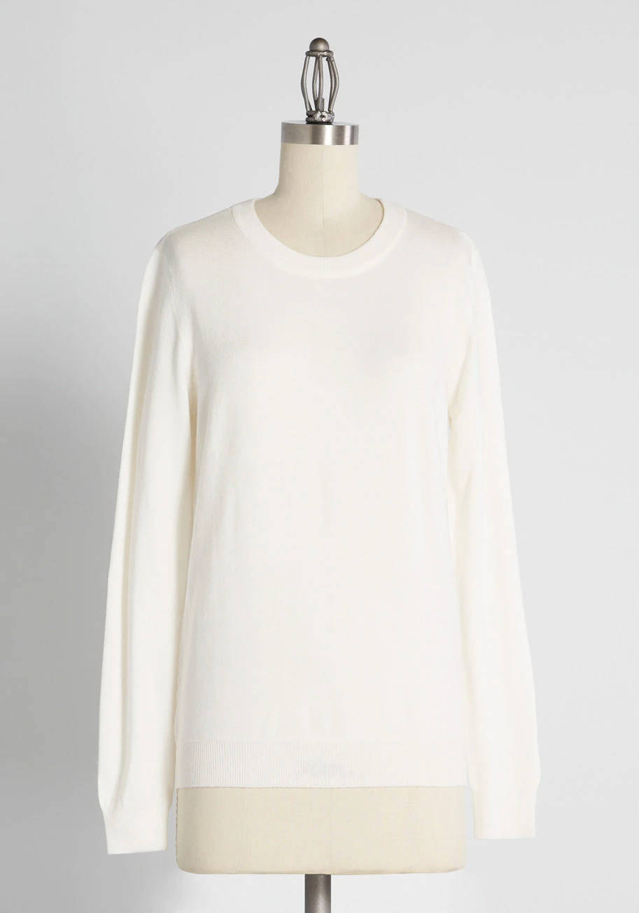 Show your style smarts in this white crew neck sweater! With long sleeves, and a fine, soft knit with ribbed edges, this solid pullover will be your favorite wardrobe staple. No matter how you wear it, this updated ModCloth namesake label piece—with improved fabric to avoid pilling—offers an A+ look.