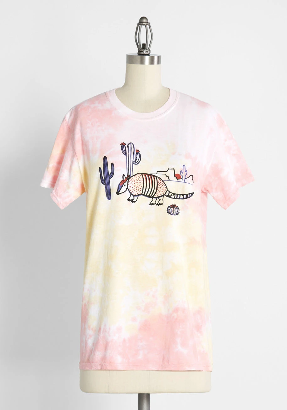 Where there’s a chill vibe, there’s a chance to take this tie-dye T-shirt for a spin! With an unique red and yellow-hued spiral tie-dye pattern all over, this tee flaunts an exclusive armadillo in the desert graphic print at the front that was designed in-house by our amazingly talented print team. Inspired by the natural beauty of the Sonoran and Mojave deserts’ sunset skies along with other-worldly plants and creatures, this illustrated graphic is bold-yet-understated thanks to its vintage-inspired line drawings and use of black, purple, blue, and red hues/ Both comfortable and essential, this durable cotton tee incorporates short sleeves, a crew neck, and a relaxed fit, creating a quintessential ModCloth namesake label look that’s undeniably effortless and elevated.