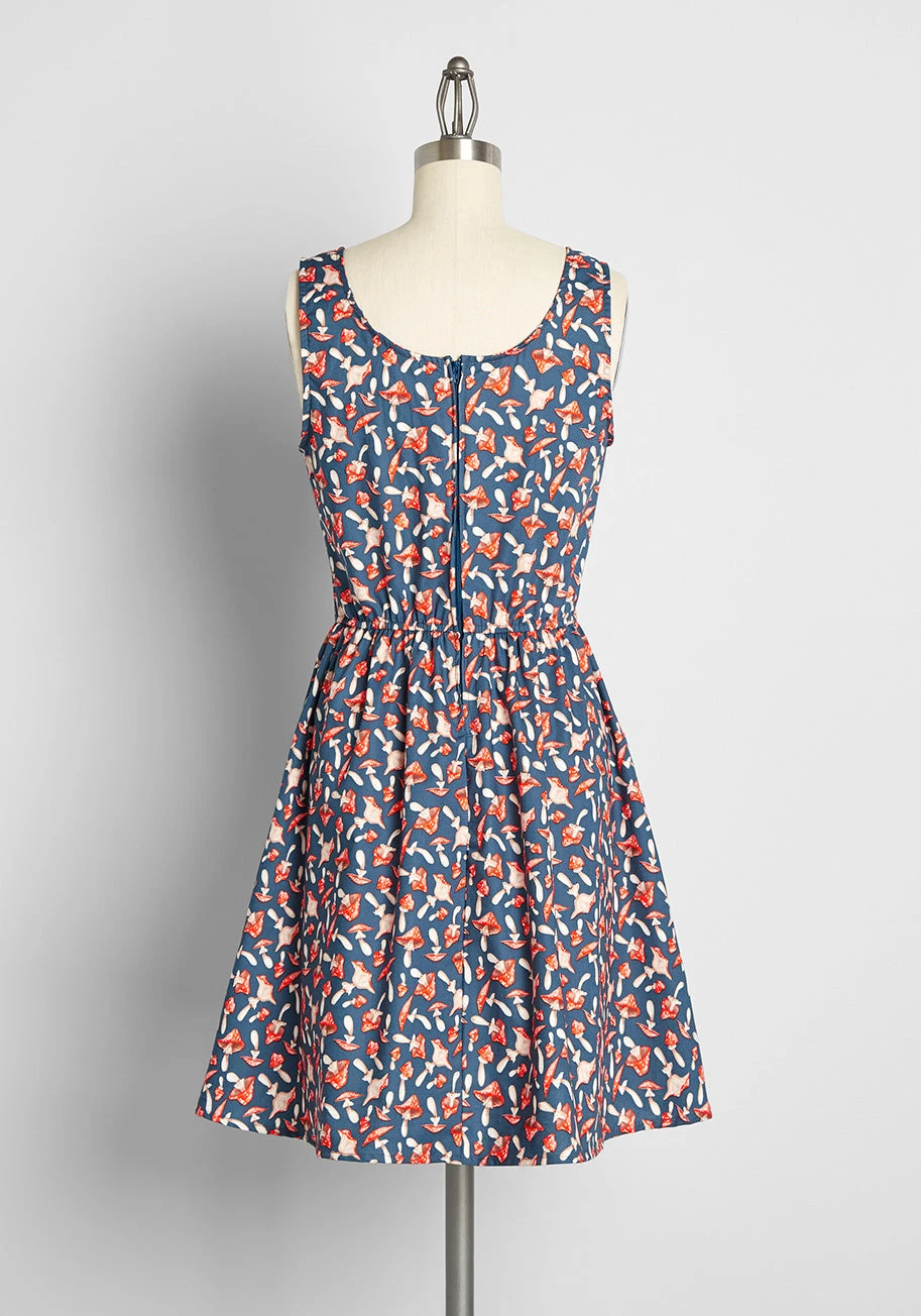 In a groovy print made up of red-capped mushrooms with ivory-hued stems, this navy blue skater dress from Retrolicious is a vintage-inspired style of psychedelic proportions! Made from a stretchy cotton fabric and boasting a round neckline, a sleeveless fitted bodice, and a gathered flare skirt with handy side pockets, this adorable fit-and-flare dress is truly unique and so retro-chic.