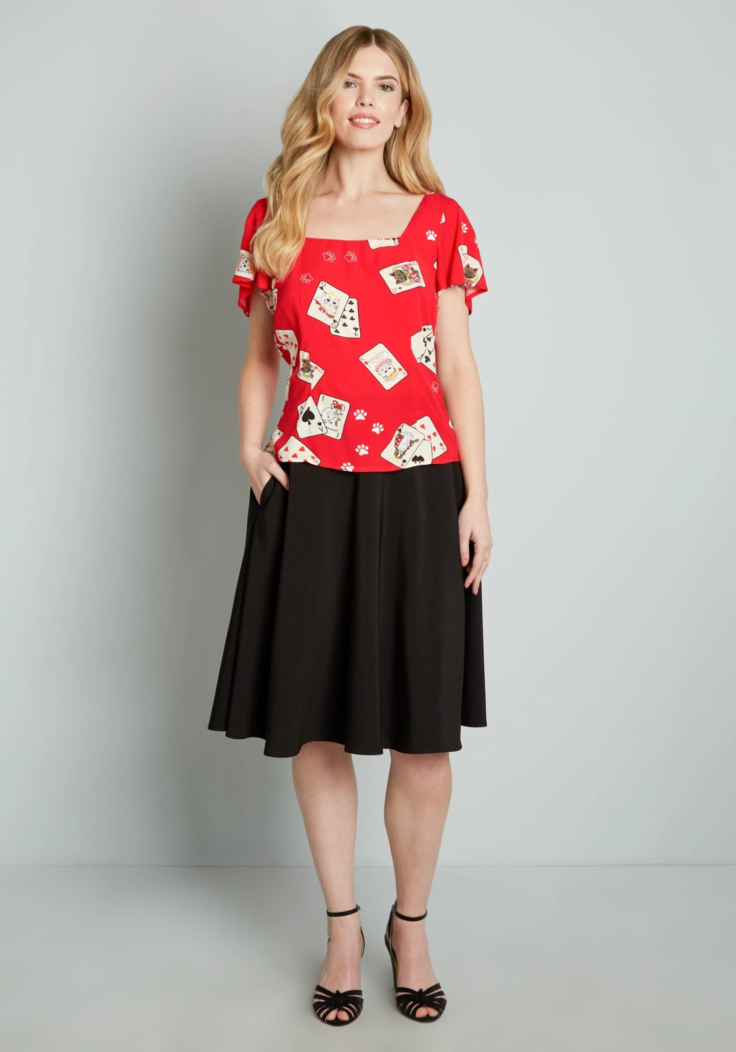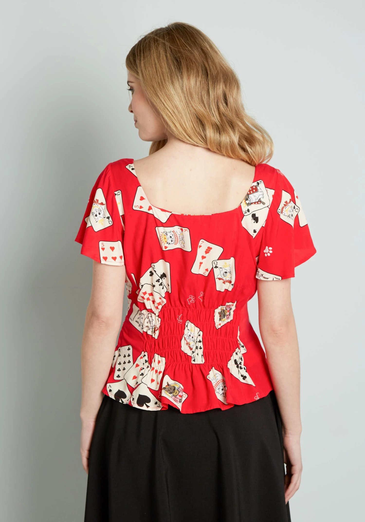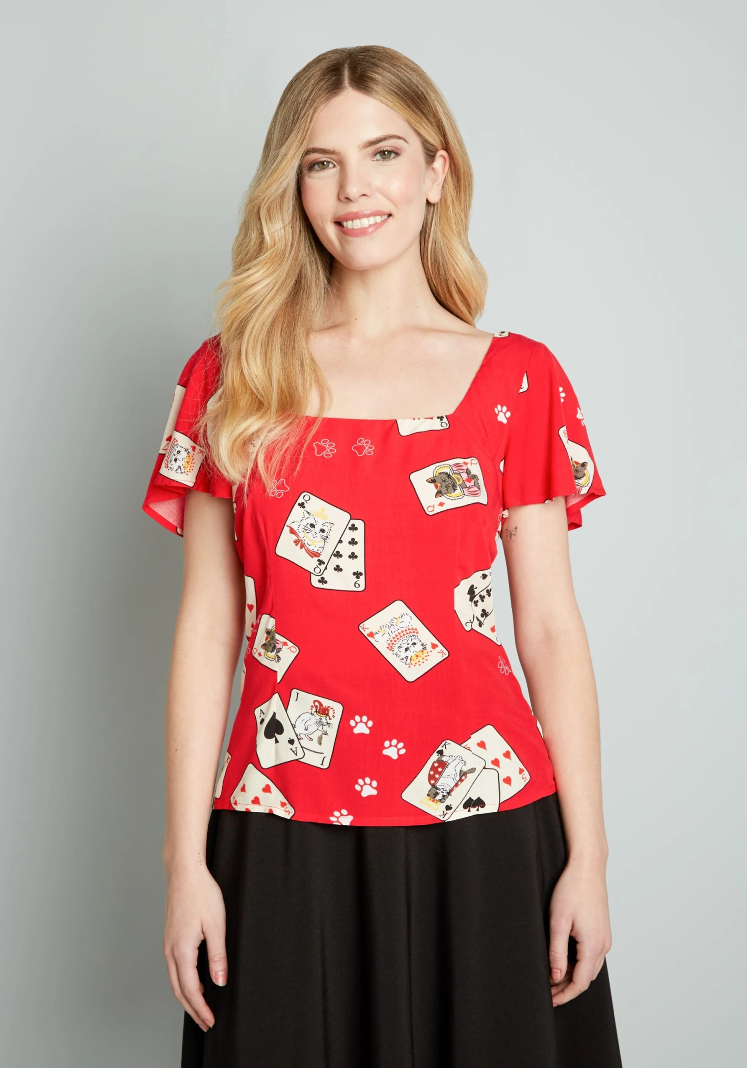 This retro-chic fitted top from UK brand Collectif features a print of a scattered deck of ivory-hued playing cards that feature cute white cats holding court as king and queen, and a white mouse as the joker amidst white paw prints throughout. Made from a vibrant red, stretchy viscose fabric, this vintage-inspired shirt boasts a square neckline, short flutter sleeves, and a shirred panel at the back waist for an easy, flattering, fitted silhouette that you’re going to love. Deal with it!