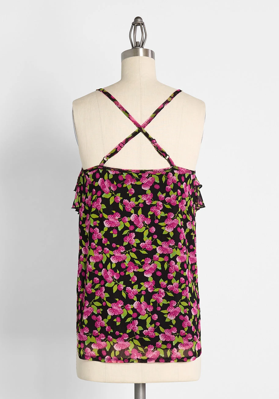 When sweet vibes are alive and well this summer, why not take that on with your style as well? This flirty black cami does just that thanks to its tiered ruffle-trim detailing at the front and back yoke seams, which drape at the front and back yoke for some fun, frilly detailing, along with the all over, exclusive print of pink raspberries hanging off of green, leafy vines. Made from a stretchy black mesh, this sleeveless top features thin cami straps at the halter neckline that adjust and cross at the back, giving it some vintage-inspired quirks that cannot be denied. This sleeveless blouse can be worn casually during the sunny summer days as well as being able to be dressed up for cocktail parties and special occasions with high-waisted bottoms, platform heels, and a lightweight blazer. The styling possibilities are endless in this ultra-flattering and flowy printed ModCloth label dress!