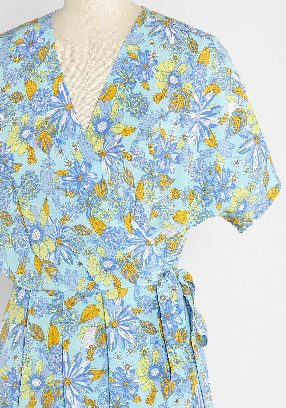 You’re not wearing this sky blue-hued wrap dress just because it’s a vintage-inspired sensation from our ModCloth namesake label with a hand-drawn floral print in vibrant shades of blue and yellow that you can’t find anywhere else. You’re wearing this dress because of the way it makes you feel! The lightweight, flowy silk fabric that keeps you cool, the short dolman sleeves that lend a flutter of femininity, the retro-fab surplice neckline, and adjustable side-tie closure at the waist that customizes to your figure─these are just some of the reasons you’ll love wearing this darling midi dress. And that doesn’t even cover the uniquely placed pleats at the front of the skirt, or the delicate tulip hemline that beautifully compliments the flowered flow of this awesome cottagecore-esque creation.