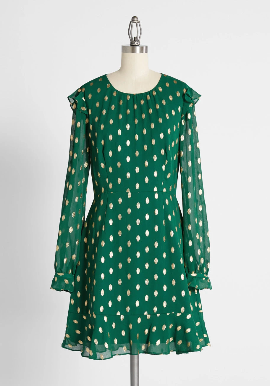 So much precious, vintage-inspired detail makes this festive, emerald green chiffon dress by Hutch a true original! Featuring metallic gold polka-dots, this mini has sheer long sleeves with ruffles at the cuffs, as well as a fluttering ruffle-trim at the shoulders that wraps around to overlay a beguiling cutout at the back. Don’t miss out on this unique find!