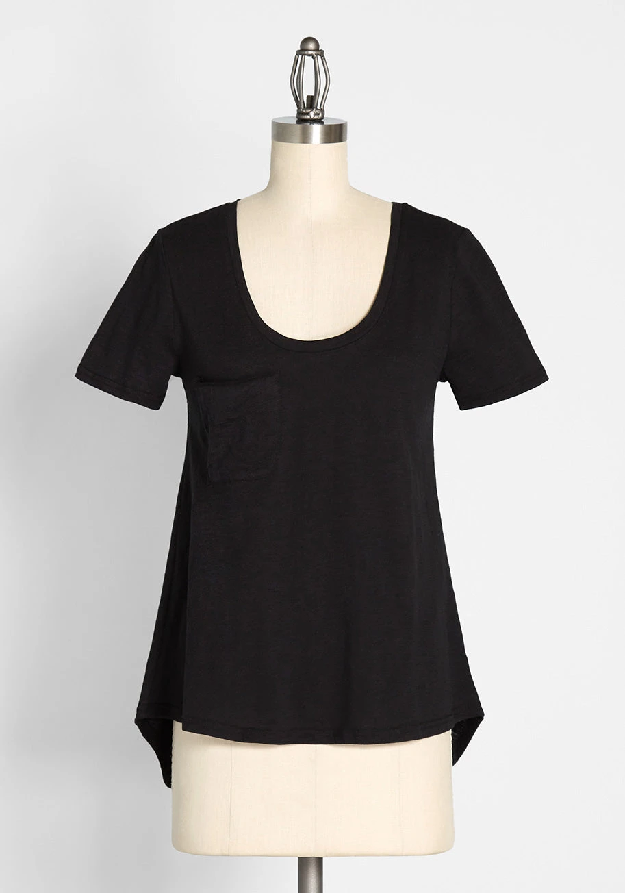 Every fashionista knows the necessity of pieces that can be infinitely styled, and this black T-shirt promises unlimited options. Opposite its scoop neckline, this ModCloth namesake label tee hides a hint of sweet style, while its patch pocket at the chest, hi-lo hem, and ultra-soft jersey knit assure boundless outfitting potential!