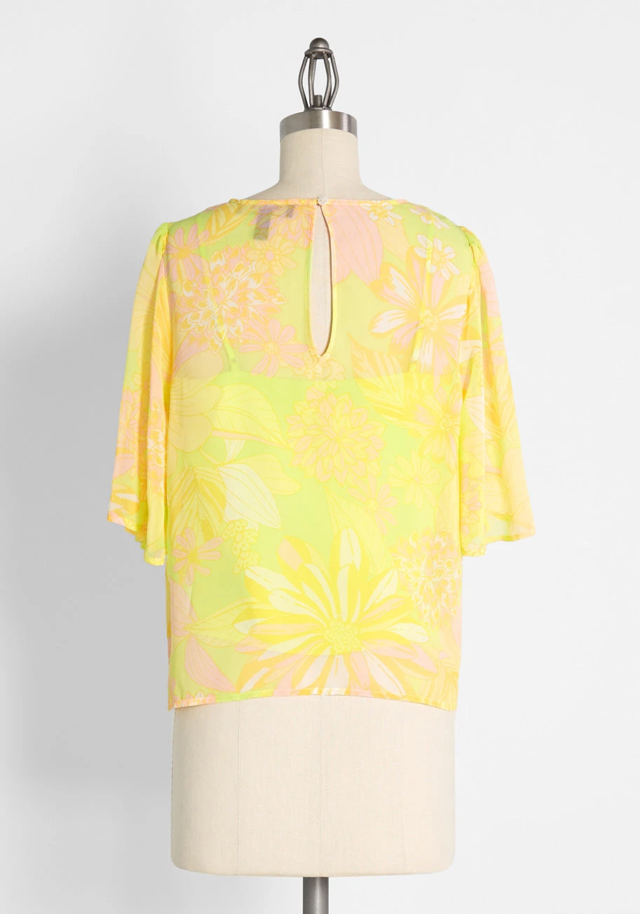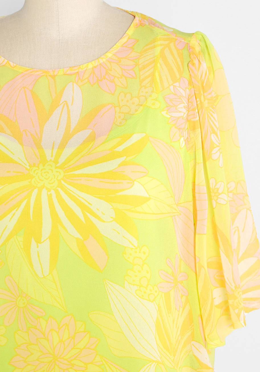 With psychedelic, neon-hued 1960s-inspired floral illustrations swirled all over, this sheer flutter sleeve blouse from our ModCloth namesake label is totally ‘outta’ sight and sure to be a welcomed addition to your summer wardrobe. Made from an ultra-lightweight recycled chiffon, this sheer top boasts an all over, exclusive vintage-inspired floral print made-up of neon lime green, baby pink, ivory, yellow, and orange that is reminiscent of 60s and 70s-sourced prints. With a crew neckline and a keyhole with button-loop closure at the back, flowy elbow-length flutter sleeves, a removable lime green camisole underneath for optional, added coverage, and a boxy cut, this effortlessly retro-chic shirt is ready for some summer style action.
