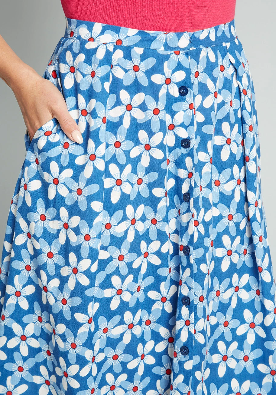 Gorgeous aster flowers with retro-chic detailing in shades of white and pale blue with bright red centers cover this azul blue A-line skirt from UK brand Pretty Vacant. Made from a breathable woven viscose, this breezy red, white, and blue midi skirt boasts a retro-chic high-rise waist, full front button closure, and hidden side pockets.