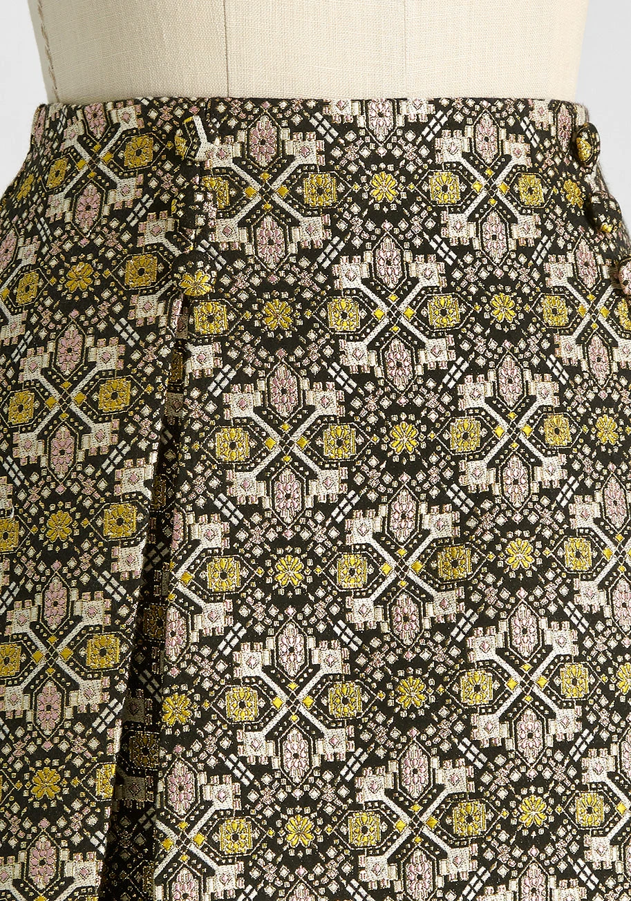 Boasting a stunning and elegant jacquard print, this exclusive pleated mini skirt from our ModCloth namesake label is as good as gold! Made from a structured woven fabric and boasting an ornate brocade-inspired design in black, pink, ivory, and metallic gold, this high-rise mini skirt features decorative buttons at the right hip, deep pleats at the front and back waist, and a flattering A-line silhouette.