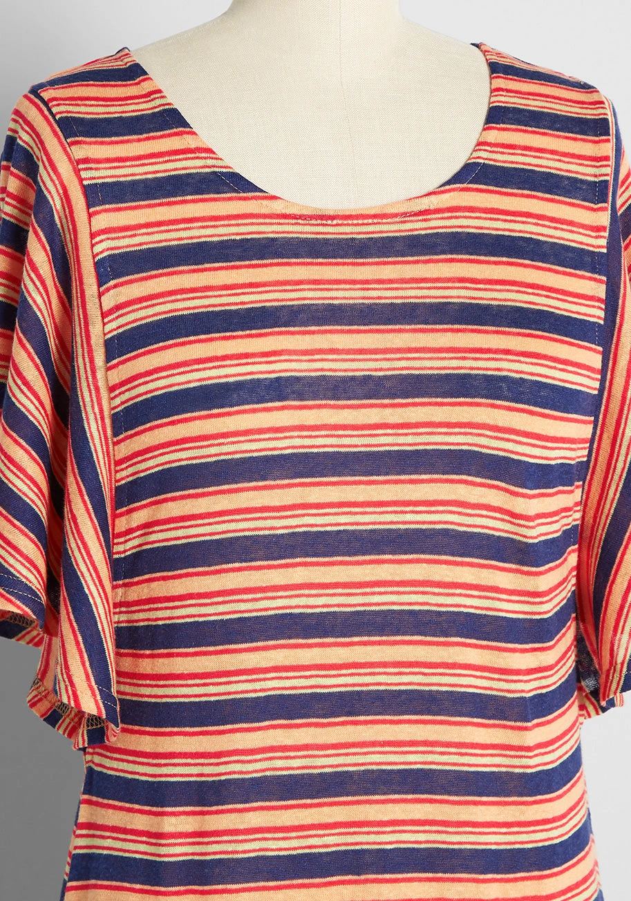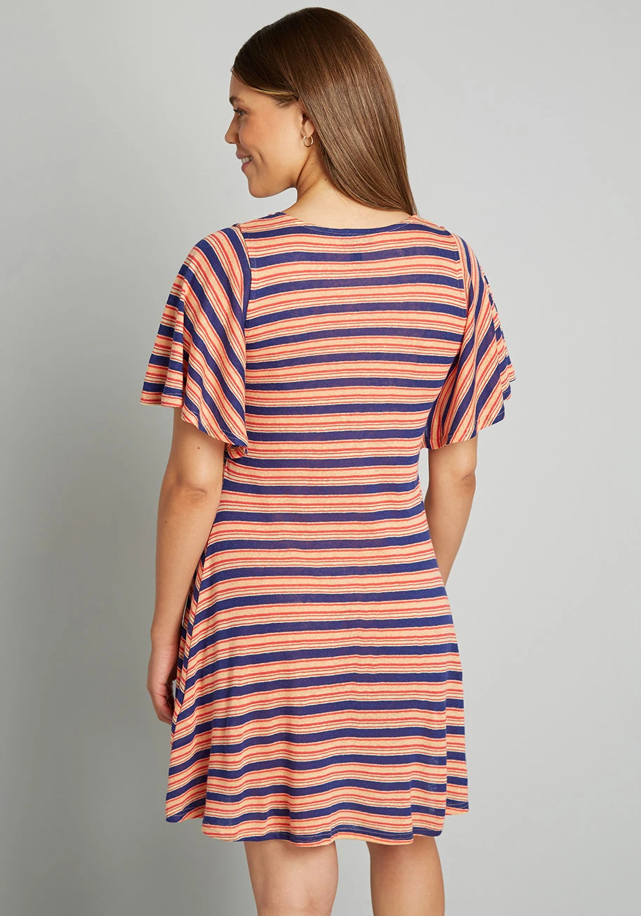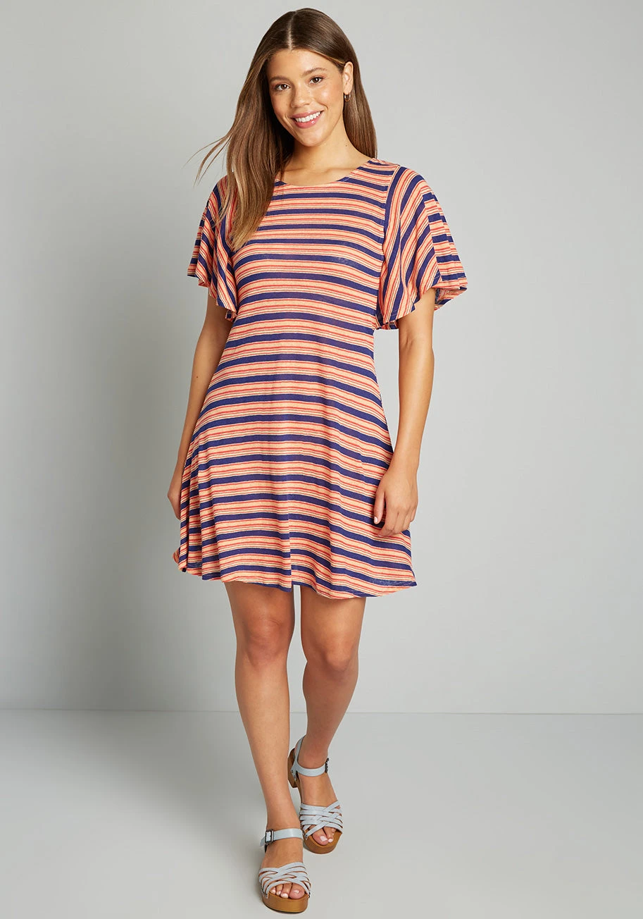 Keep things simple-yet-stylish in this effortlessly retro-chic T-shirt dress from our ModCloth namesake label! The elevated choice for a casual day, this A-line mini boasts a 70’s-inspired print of navy blue, yellow, and orange that is accented with smaller red stripes throughout. Made from a lightweight linen-blend knit and featuring a round neckline, breezy flutter sleeves, and a relaxed silhouette, this adorable slip-on dress is a quick and easy way to feel good and look great!