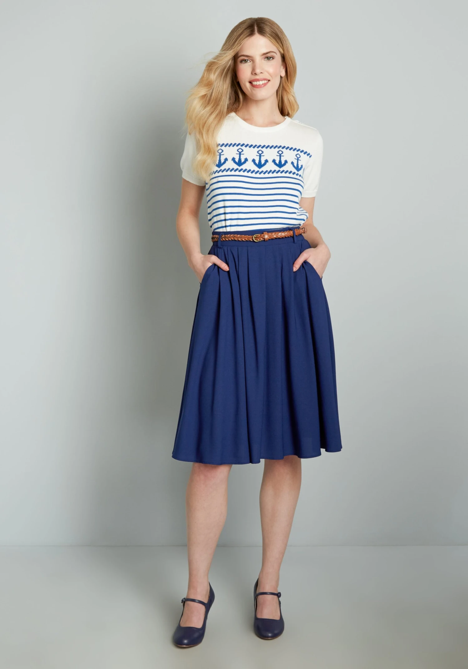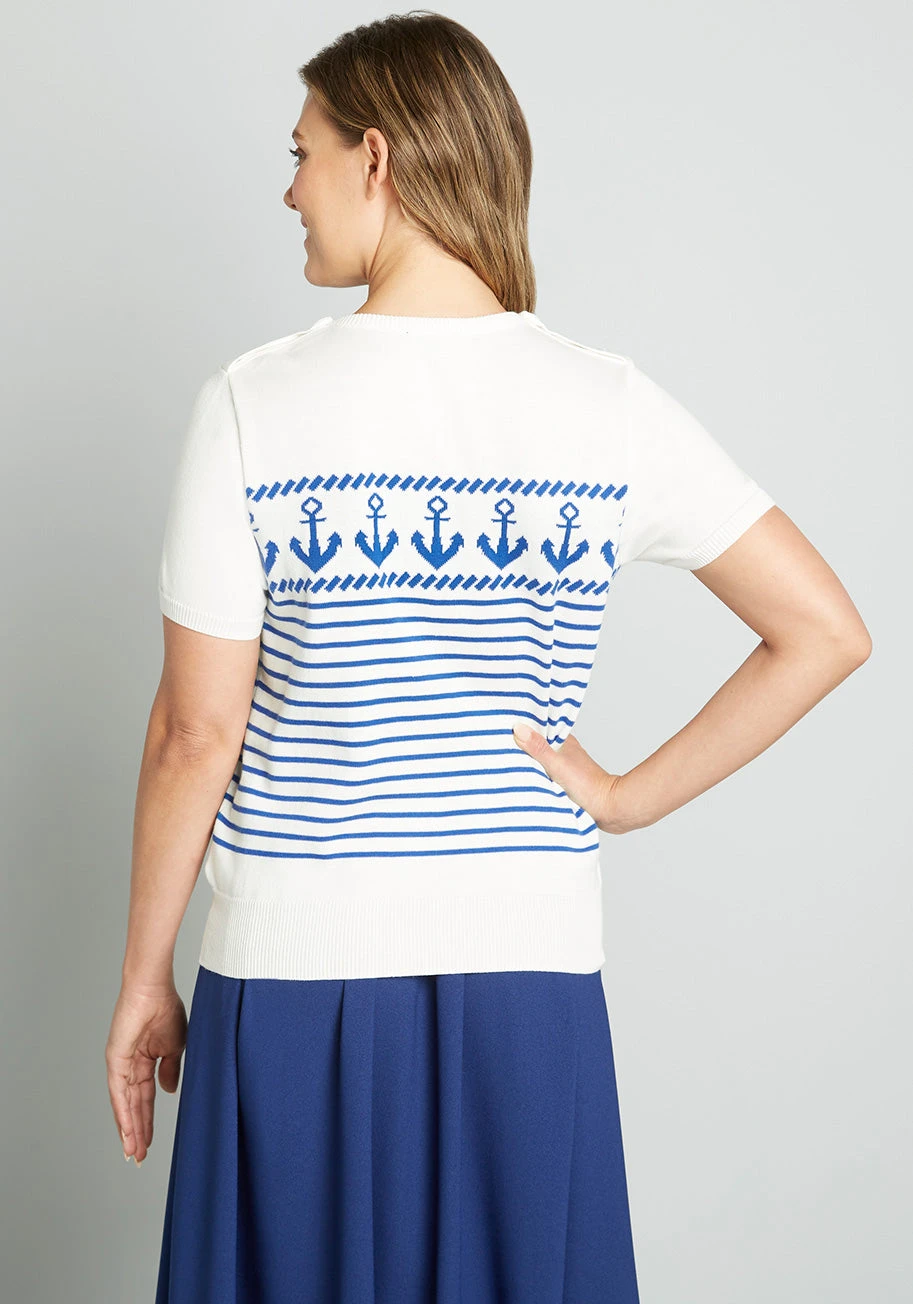 Get swept away by nautical-inspired sweetness in this cream-hued knit top from UK brand Pretty Vacant. Made from a stretchy knit fabric, this short sleeve sweater boasts a round neckline, bright blue anchor motifs at the yoke surrounded by geometric borders, and a retro-chic, blue striped design throughout the bodice.