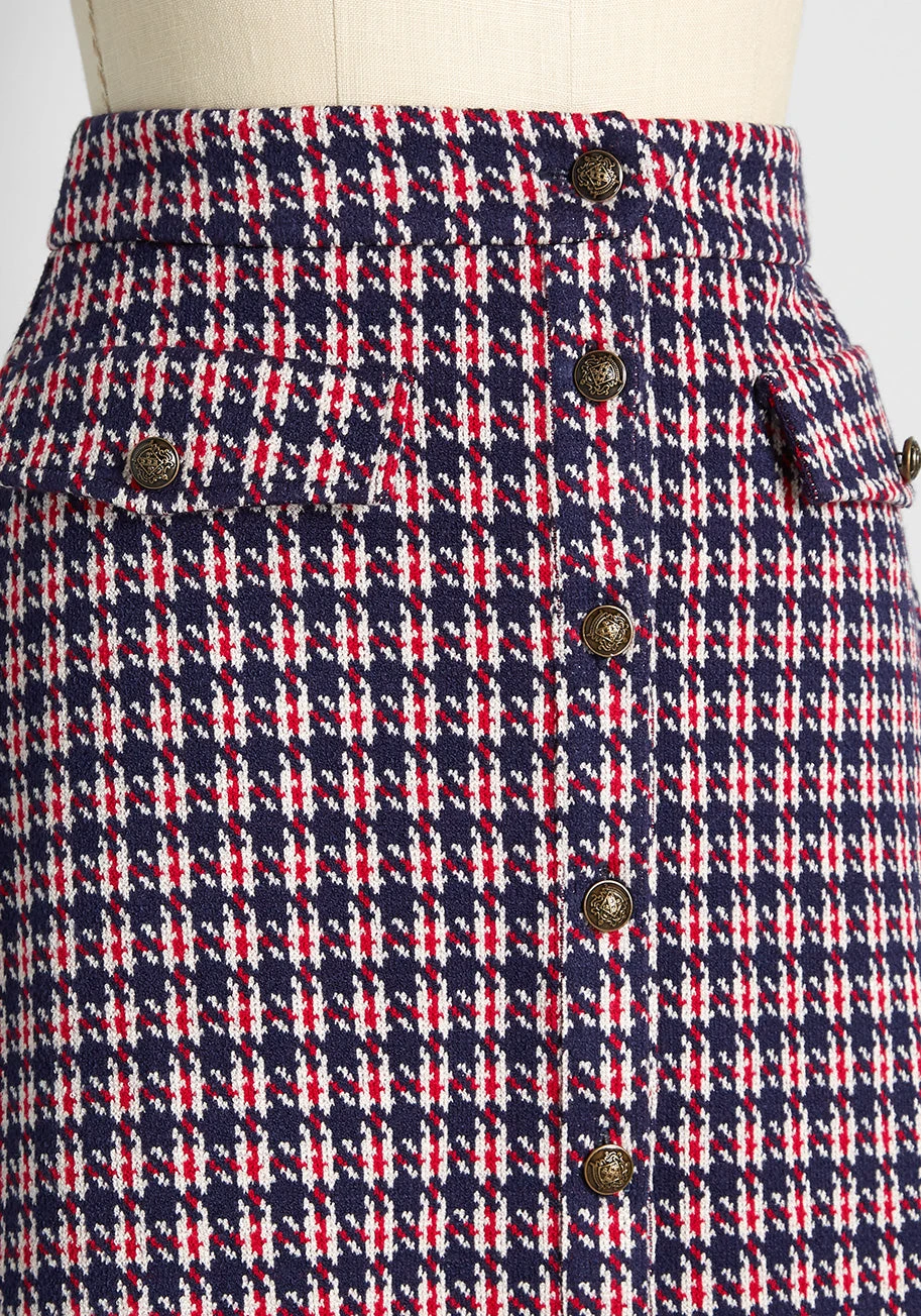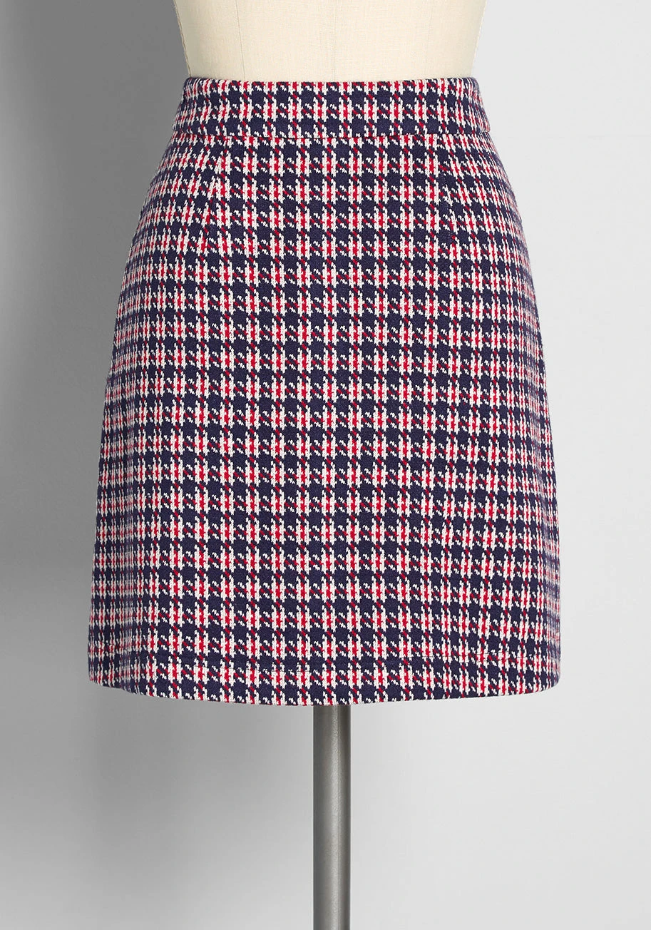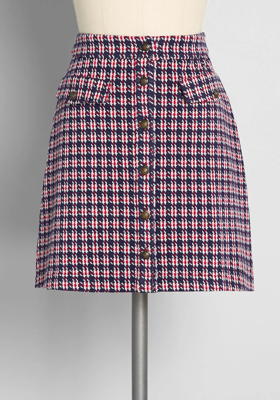 Your retro-chic style it’s positively buzzworthy in this darling A-line skirt from our ModCloth namesake label! Boasting a unique houndstooth plaid design in shades of navy blue, red, and ivory, this plaid mini skirt is truly timeless. Made from a stretchy woven fabric and featuring front button-up closure and front faux-pockets with button closure, this nautical high-rise mini is effortlessly styled to vintage-inspired perfection.
