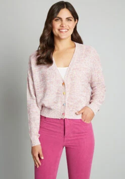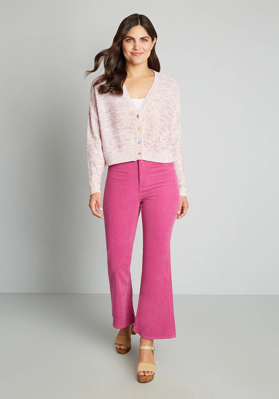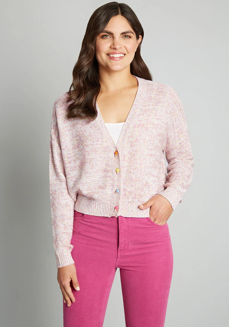 Sweetness makes the world go round in this precious pink cardigan from our ModCloth namesake label! Boasting a marled, drop stitch fabric knitted in delicate shades of pink, ivory, and yellow, this subtly cropped button-up sweater boasts long sleeves, adorable ice cream cone-shaped button-up closure, and a slightly boxy silhouette. So cute!