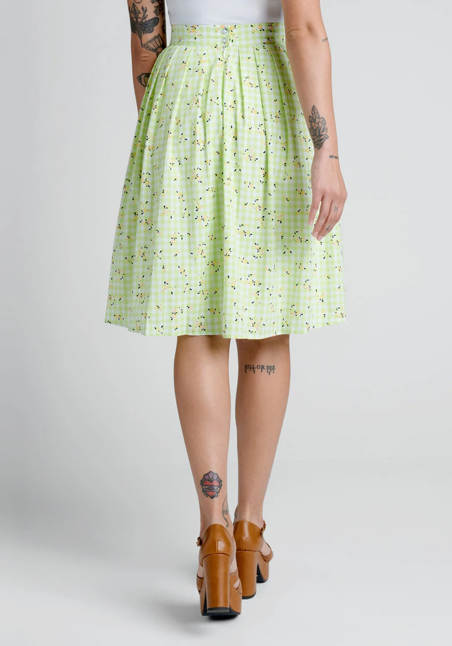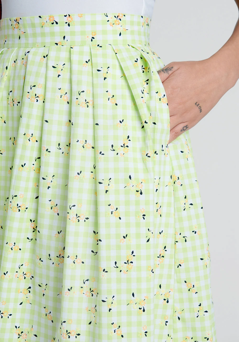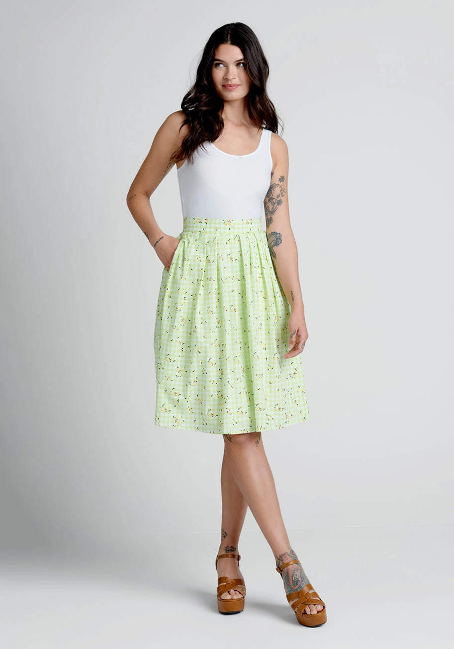 Inspired by 1975’s Australian cottagecore aesthetic, this fresh pleated A-line skirt from our ModCloth namesake label is a vintage-inspired essential with an exclusive spring green and white gingham printed cotton-blend fabric that has been custom printed with tiny, 3D yellow, pink, and purple floral blossoms throughout from our ModCloth namesake label. Featuring a high-waistline with button closure at the back and handy side pockets, this fully-lined knee-length skirt will elevate your retro fashion game with style and ease.