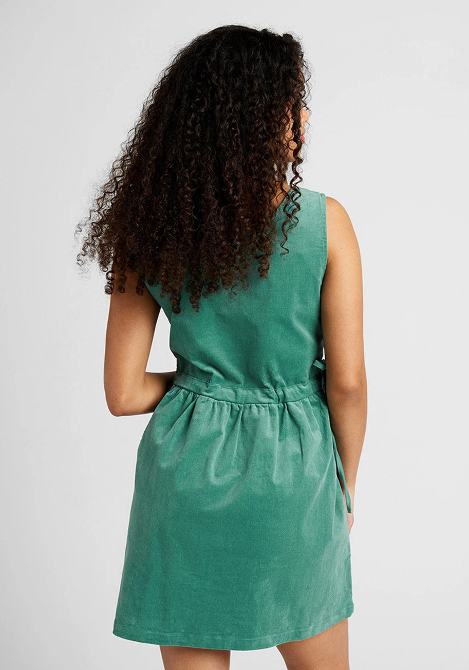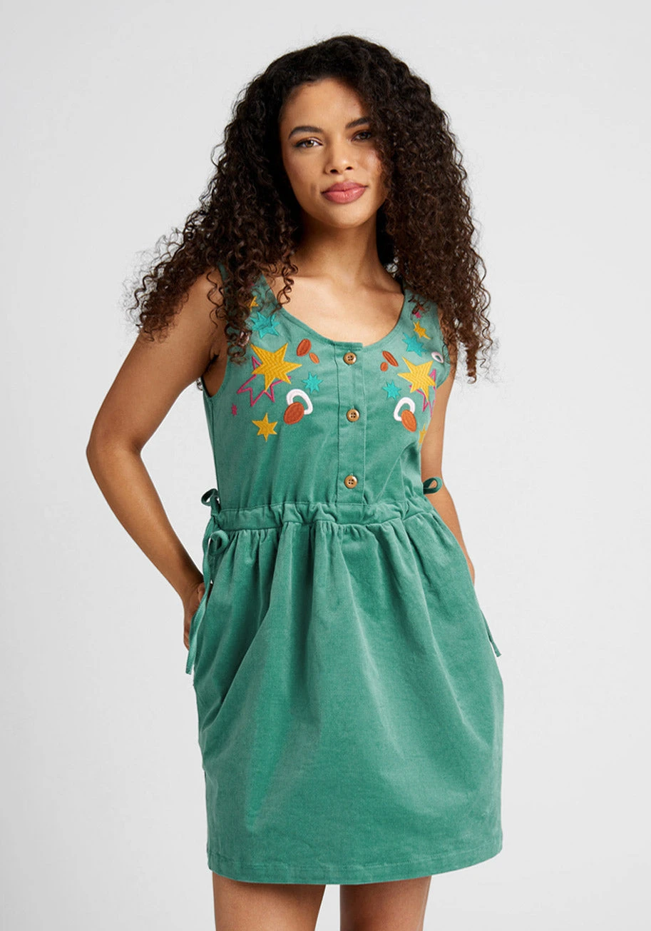 So fun and free-spirited, this teal green jumper from Aussie brand Dangerfield is beautifully embroidered at the front bodice with vibrant starbursts and quirky motifs in shades of pink, yellow, blue, orange and white. Made from mid-weight soft cotton blend, this adorable pinafore dress boasts a sleeveless bodice with button up detailing at the round neckline, a gathered waistline with a dual side-tie design, and a playful A-line mini skirt.