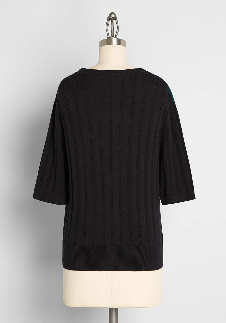 You’re so retro-chic and yet so very comfy in this cable knit sweater! Made from a cotton knit, this black knit top boasts a teal-hued insert at the front yoke that features a beautiful open-knit pattern and a scalloped edge, while the rest of the sweater is covered in a gorgeous cable knit texture. Featuring elbow-length sleeves and an easy fit, this adorable knit top is a vintage-inspired must-have.