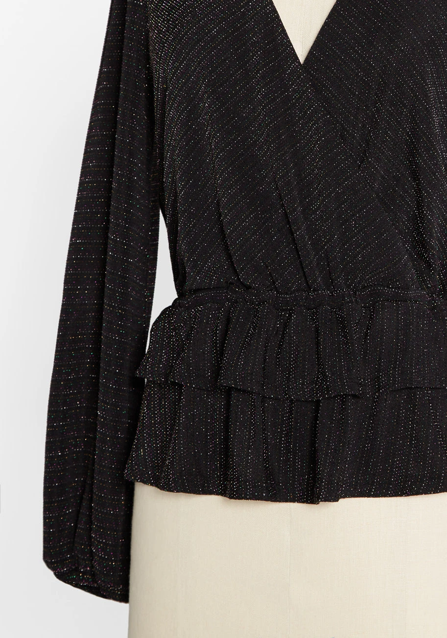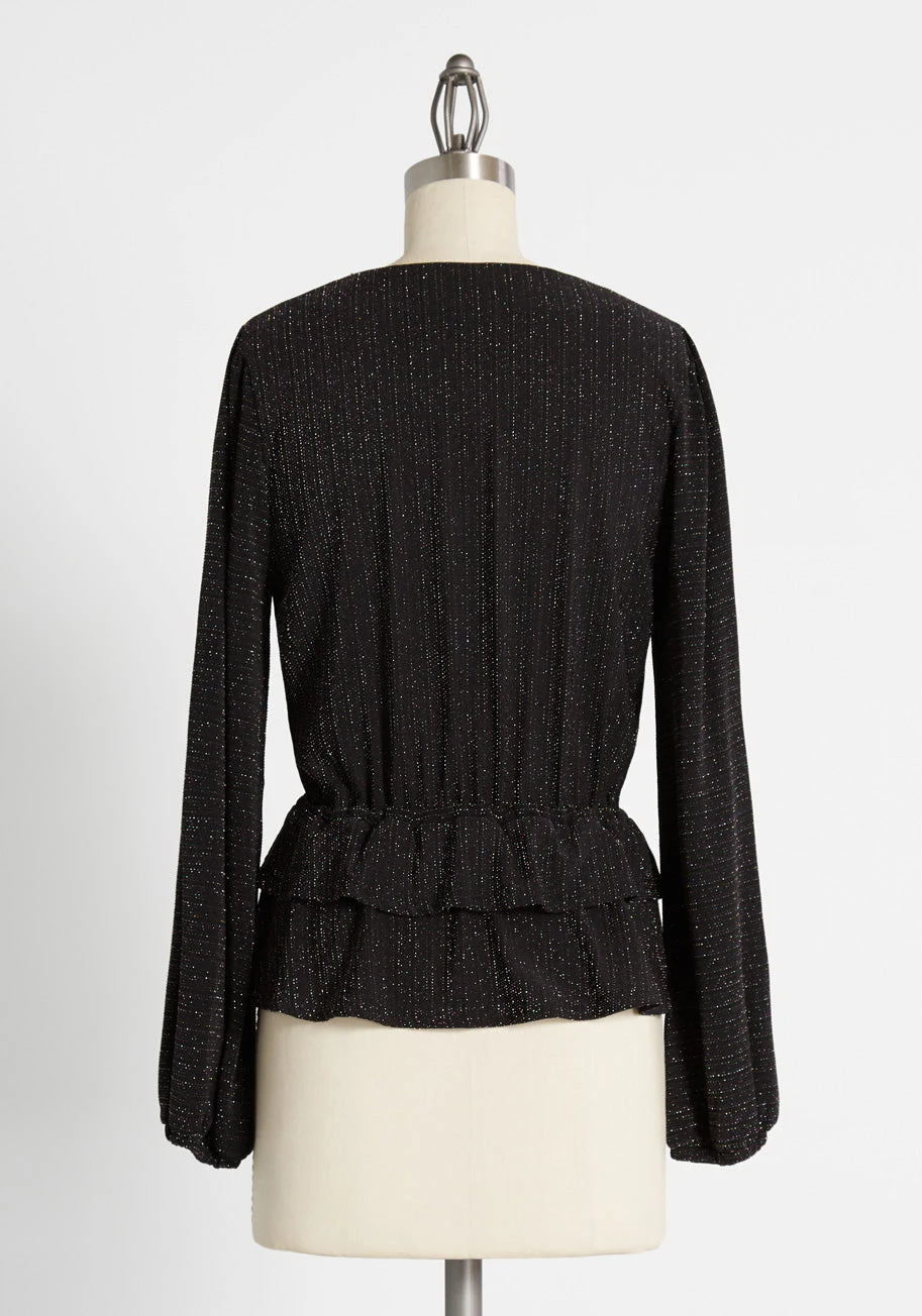 When there is something worth celebrating, let us lift your spirits with styles that shine. Get celebrating with this dazzling black peplum top from our ModCloth namesake label. Featuring sparkling lurex finish atop a surplice neckline, this unlined, semi-sheer number provides just enough stretch to toast a new chapter.