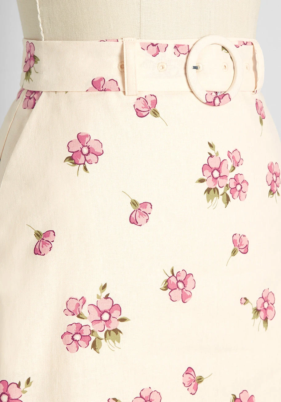 Delicate pink blossoms tumble daintily throughout this cream-hued mini skirt from Aussie brand Princess Highway. Made from a stretchy cotton-linen weave, this A-line skirt boasts a matching and removable belt, handy side pockets, and a retro-chic, high-rise waistline.