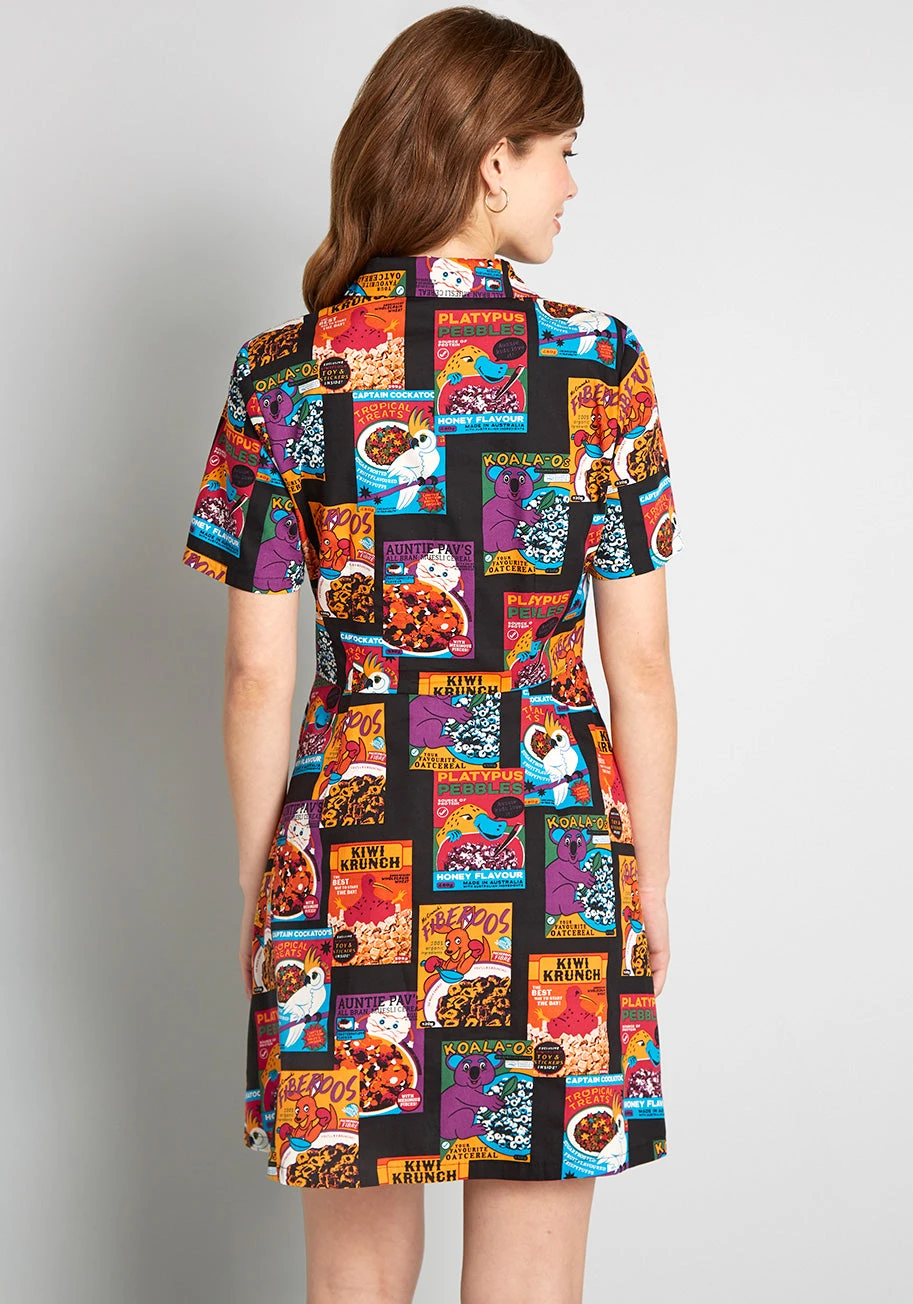 Boasting a vibrant display of Aussie-themed, retro-inspired cereal boxes in vibrant shades of blue, orange, red, and purple, this adorable black shirt dress from Aussie brand Dangerfield is such a unique find! Featuring a smart point collar with button-up closure at the bodice, this short-sleeve mini is made from a lightweight cotton weave and is finished with handy side pockets, and an adorable A-line silhouette.