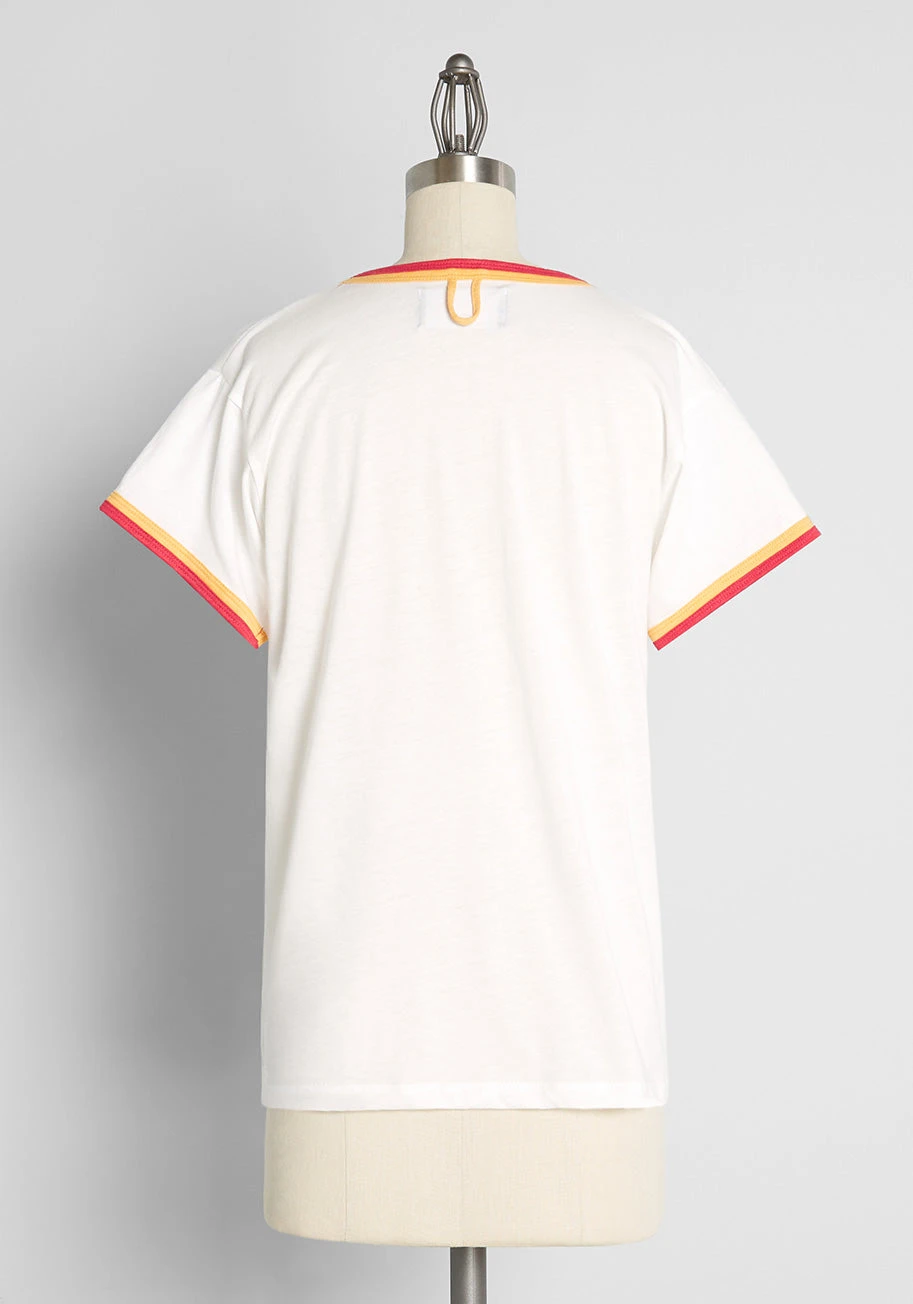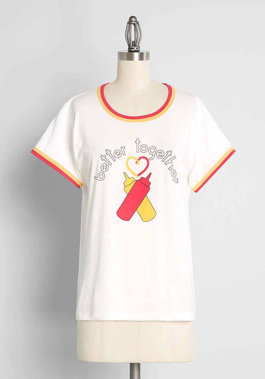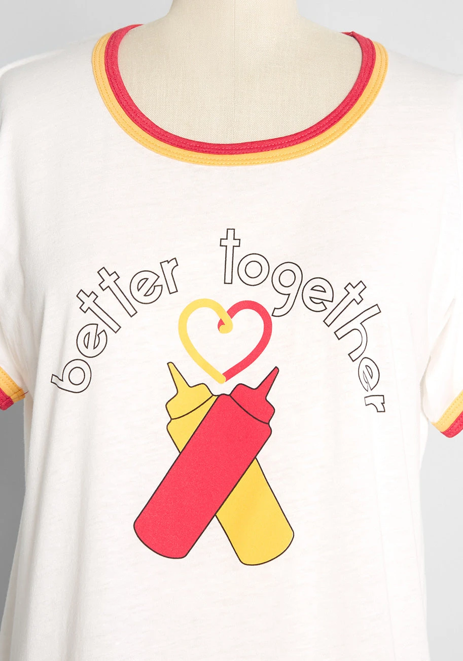 Spread a message of unity in this ivory cotton-blend ringer tee from CAMP collection! Boasting co-mingling ketchup and mustard bottle motifs at the front under a red and yellow heart, this darling graphic T-shirt reads “better together.” Featuring short sleeves, a crew neckline, and yellow and red ringer stripe detailing at the neck and cuffs, this retro-chic shirt with an easy fit is full of good vibes and makes a fun and free-spirited layering piece.