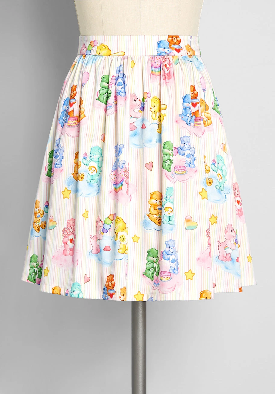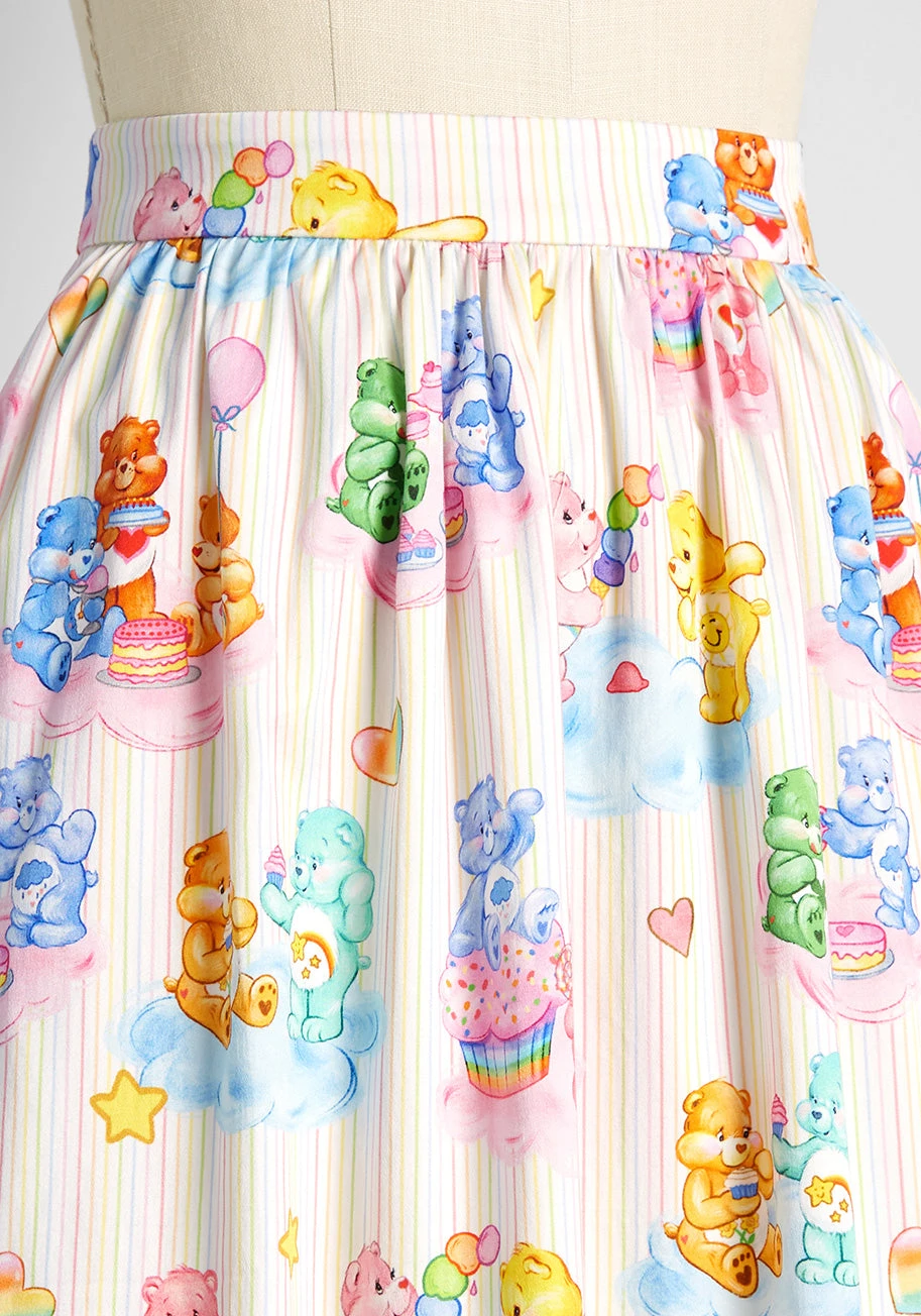 This retro-chic skater skirt, a customer favorite from our ModCloth label, is given an adorable, 80’s-inspired upgrade thanks to our recent ModCloth X Care Bear collab! Made from a cotton-blend sateen fabric in an ivory-hue, this A-line skirt boasts an exclusive hand-drawn print of all your favorite Care Bears gathered on fluffy pink and blue clouds to share a feast of delectable sweet treats amidst the stars! Featuring a high-rise, gathered waistline, handy side pockets, and a vintage-inspired silhouette, this ample A-line skirt couldn’t possibly be any cuter.
