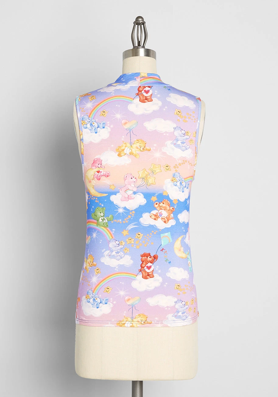 Fluffier than the clouds they play on, this delightful mock neck top from our ModCloth x Care Bears collab features a sky party with all your favorite Care Bears! Made from a soft and stretchy viscose-blend fabric and boasting an exclusive hand-drawn print of adorable Care Bears resting on fluffy white clouds, sliding down rainbows, hanging from the crescent moon, and socializing with the stars atop a blue and pink ombre background, this retro-chic sleeveless top is 80’s-inspired perfection.