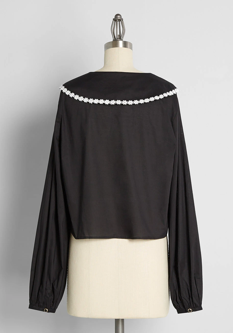 So unique and delightfully vintage-inspired, we bring you this black long sleeve blouse from our latest ModCloth x Collectif collab! Made from a lightweight woven cotton fabric and boasting front black button-up closure, long blouson sleeves with button closure at the cuffs, and a stunning puritan collar that features a beautifully embroidered, contracting white daisy trim throughout, this button-up top is an effortless way to take your retro-chic fashion game to the next level.