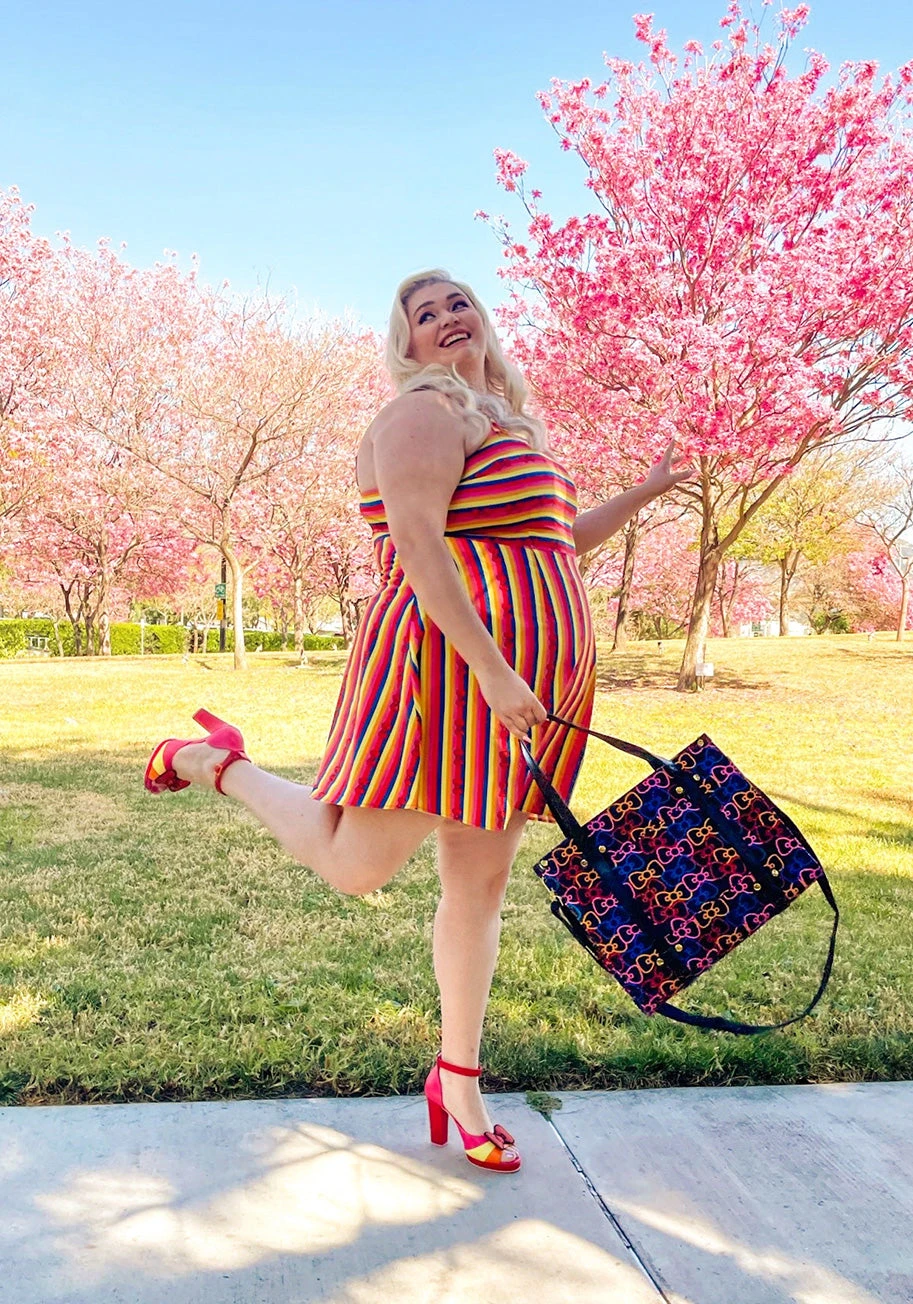 Kawaii-inspired style gets a retro reboot with this fabulous fit-and-flare dress from our latest ModCloth x Hello Kitty collab! Made from a stretchy woven fabric with an all over striped print in vibrant shades of red, pink, blue, yellow, and orange, this sleeveless number boasts adjustable yellow straps with rainbow-striped bow detailing at the front, a stylish square neckline, and a knee-length flare skirt. Perfectly enhanced by Hello Kitty’s iconic red bow printed throughout, this darling A-line cotton dress will hold a place of high honor in your vintage-inspired wardrobe.