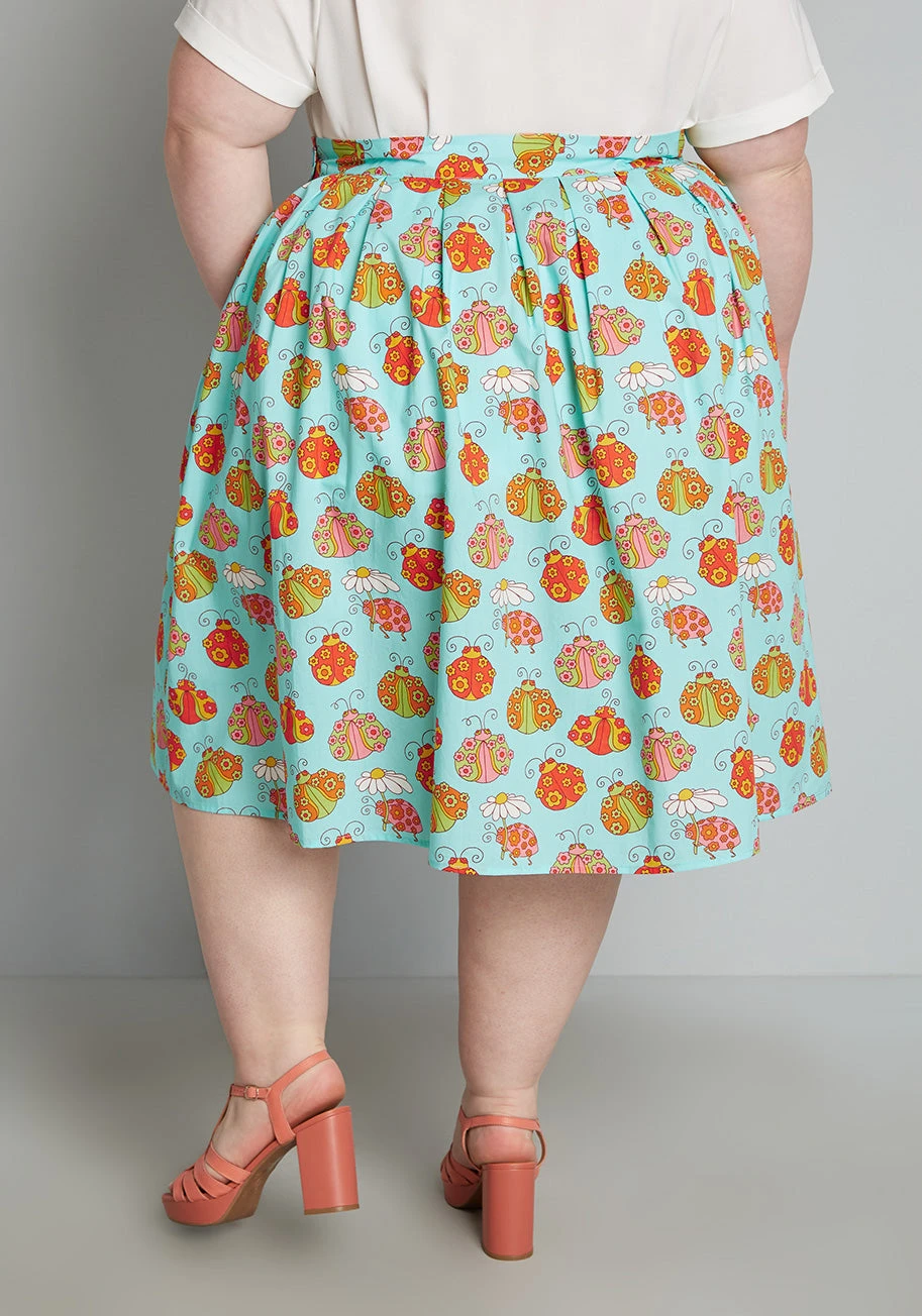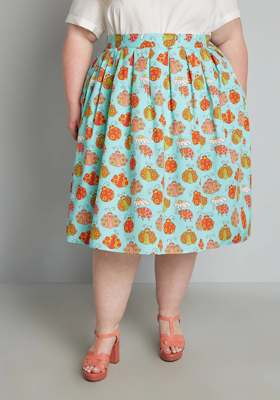 We are so excited to bring you this sky blue pleated skirt from our debut collaboration with Marisol Muro that boasts an exclusive, hand drawn print of florally adorned ladybugs in shades of pink, green, red, and yellow. Made from a lightweight woven fabric, this high-rise circle skirt boasts stylish pleats throughout, handy side pockets, and a retro-chic A-line silhouette. Such a unique piece, you’ll love the summertime vibes that Marisol’s artwork brings to this fabulous swing skirt.