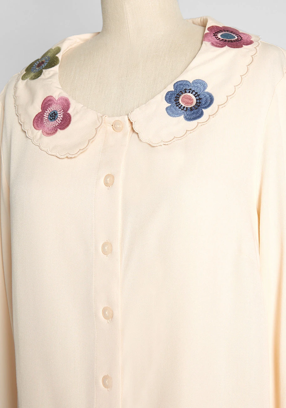 We’ve done it again! We’ve collaborated with Princess Highway, Melbourne’s most popular vintage-inspired label, for another exclusive collection. This cream button-up blouse couldn’t get any sweeter with its long sleeves with button-closure at the cuffs, and a darling Peter Pan collar adorned throughout with intricately embroidered daisy motifs in shades of pink, blue, and green. Made from a lightweight woven fabric, this retro-chic top is so much fun to style with all your favorite high-rise bottoms.