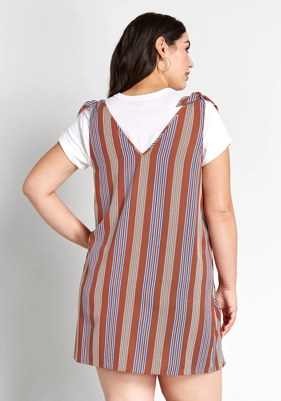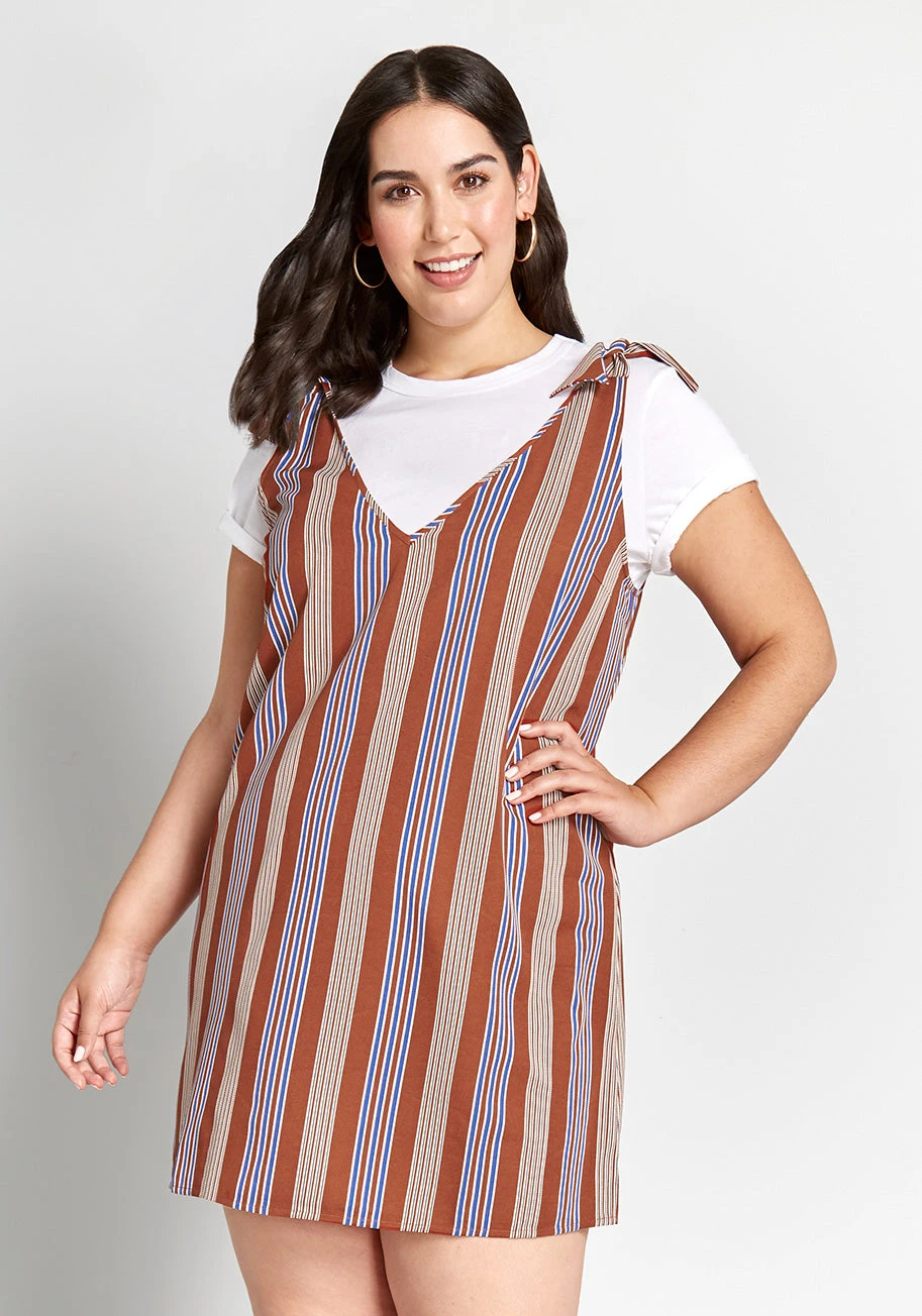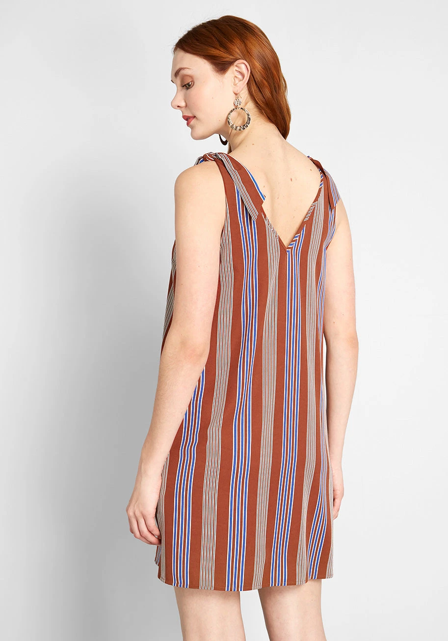 Once this rust-colored shift dress from our ModCloth label hits your wardrobe, you’ll be arranging occasions just to show off its V-neckline, tonal striped pattern, shoulder ties, and mini silhouette. And since this casual mini is sleeveless, it can be layered with your basic tees!