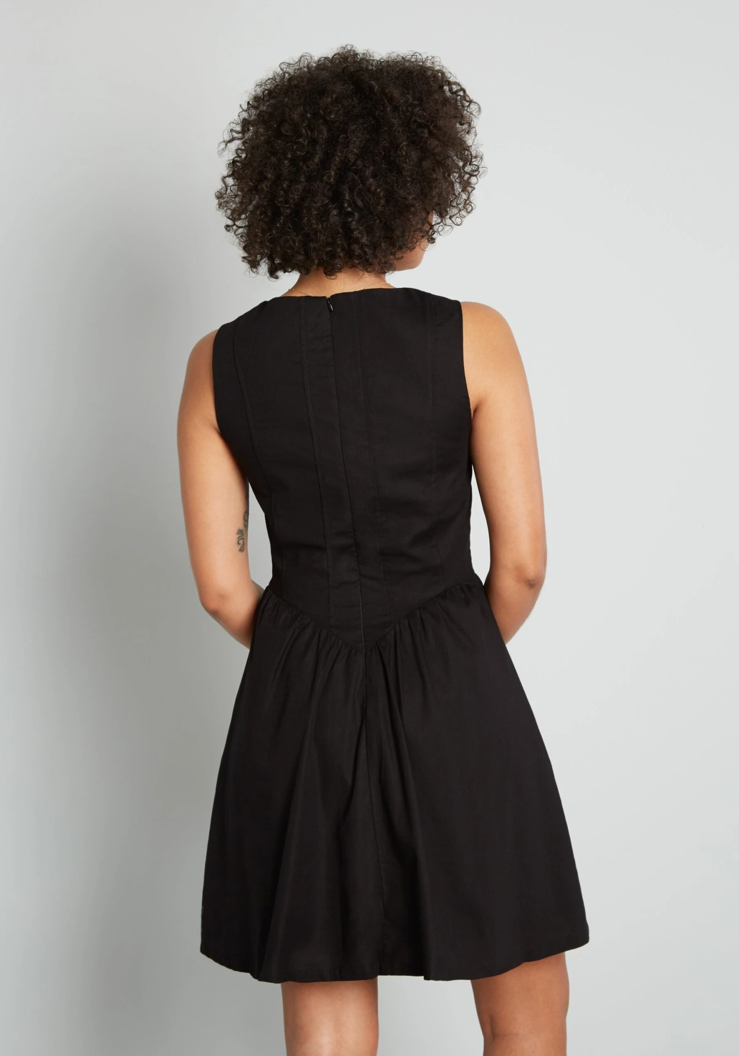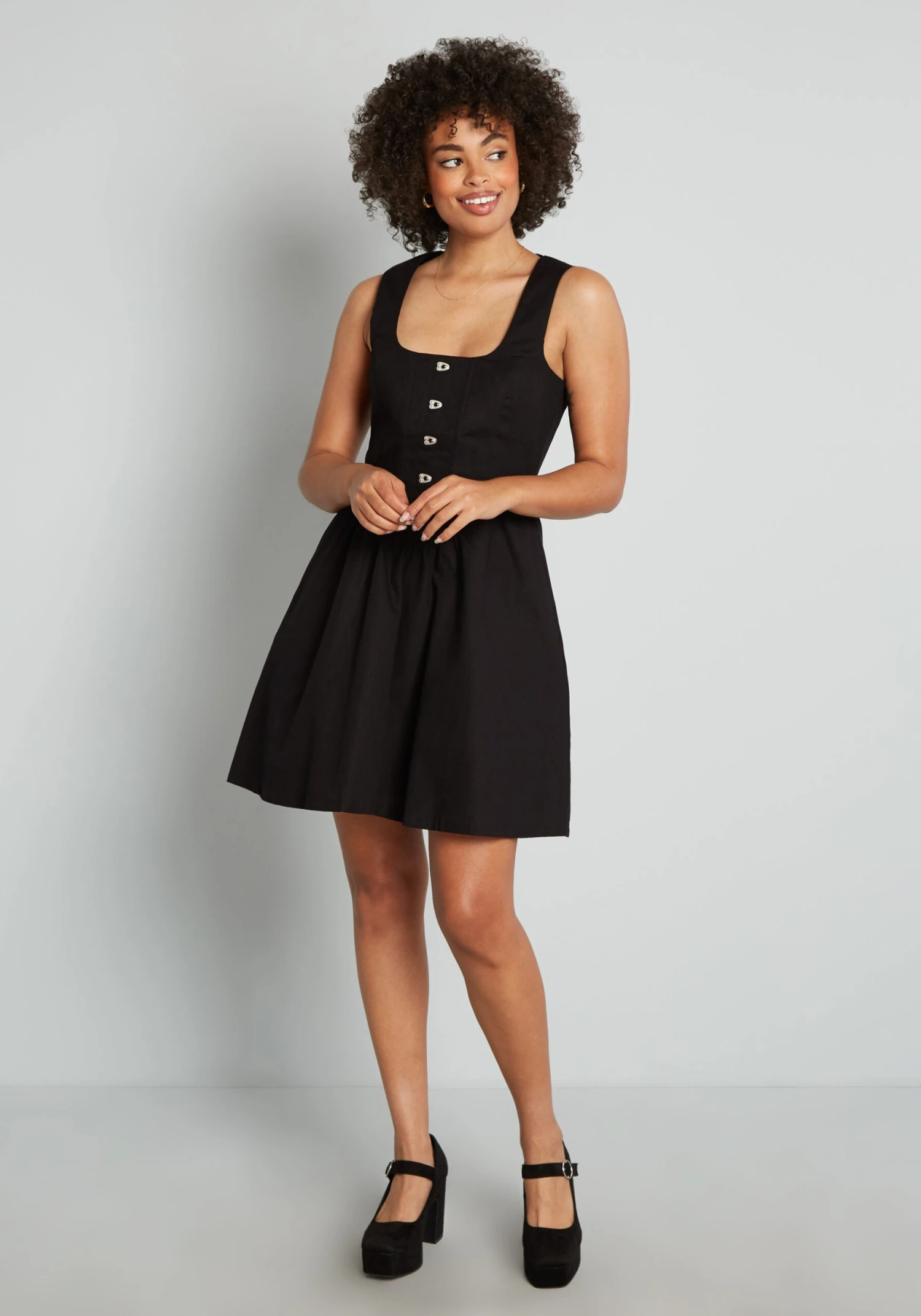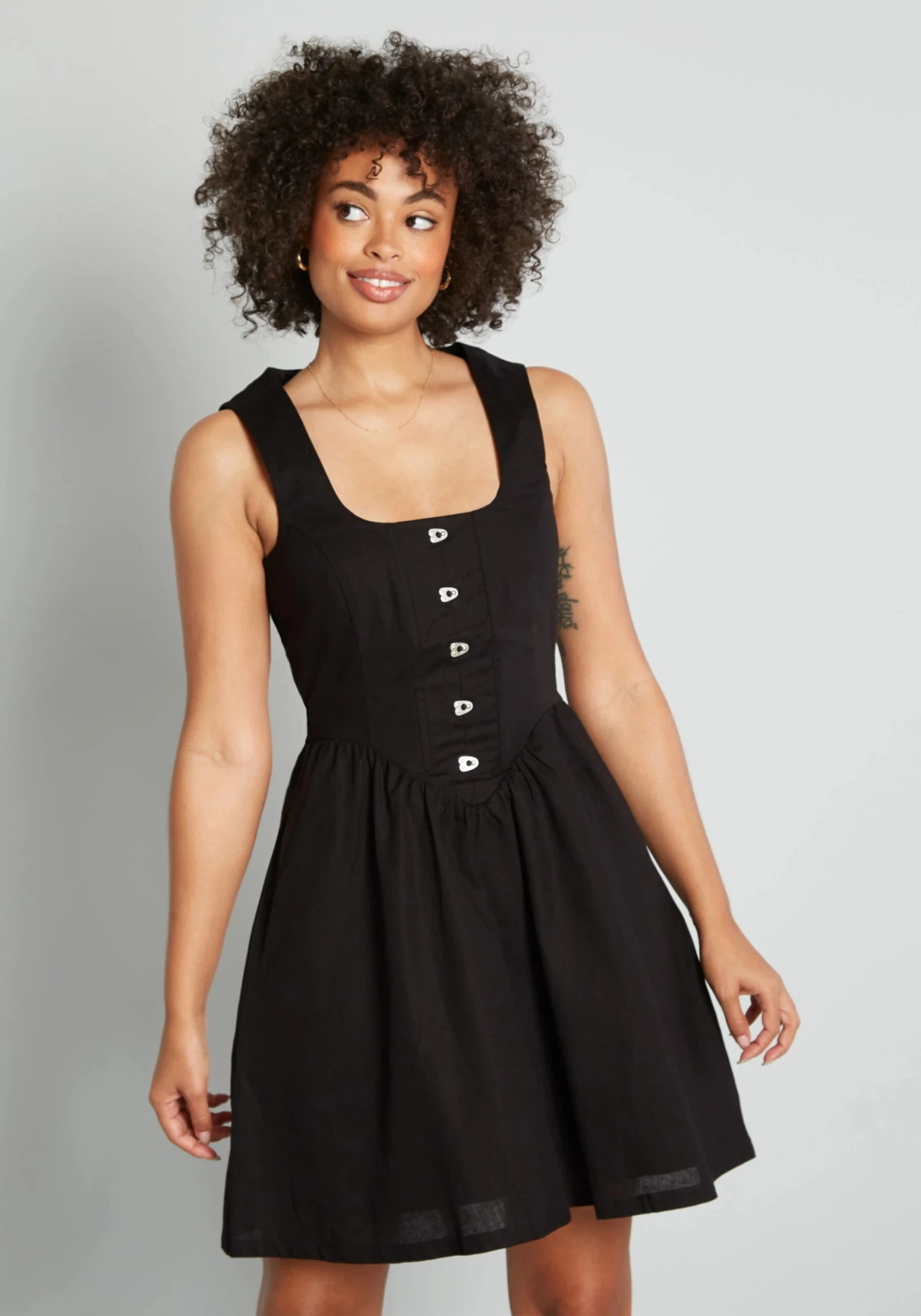 Channeling a Victorian-era romance with a 90’s goth streak, this effortlessly edgy black mini dress from Aussie brand Dangerfield will add a little drama to your wardrobe! Made from a stretchy cotton weave, this sleeveless black dress boasts a striking corset-inspired bodice with a squared neckline and decorative metal clasps up the front, a gathered waistline, and a flowy A-line mini skirt with handy side pockets.