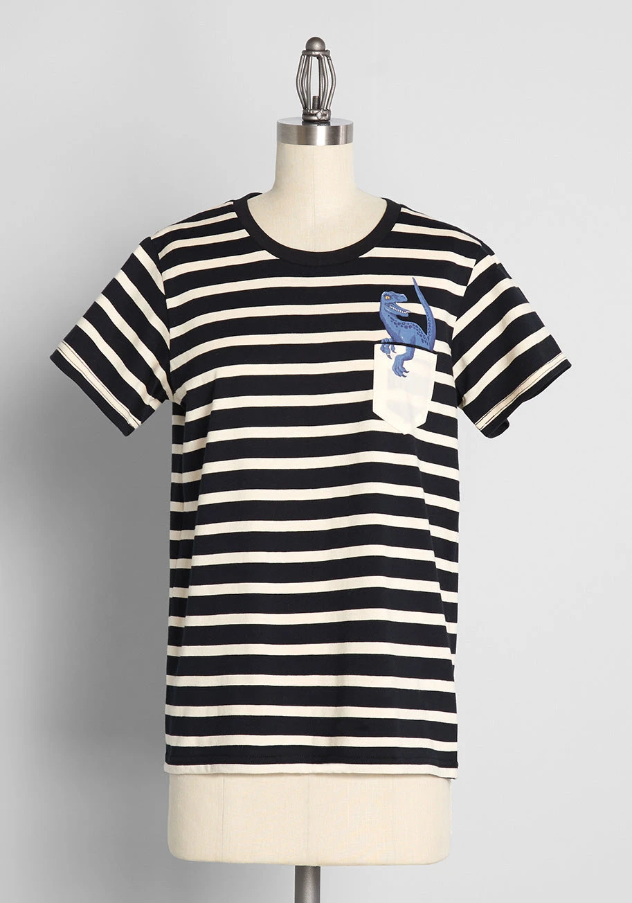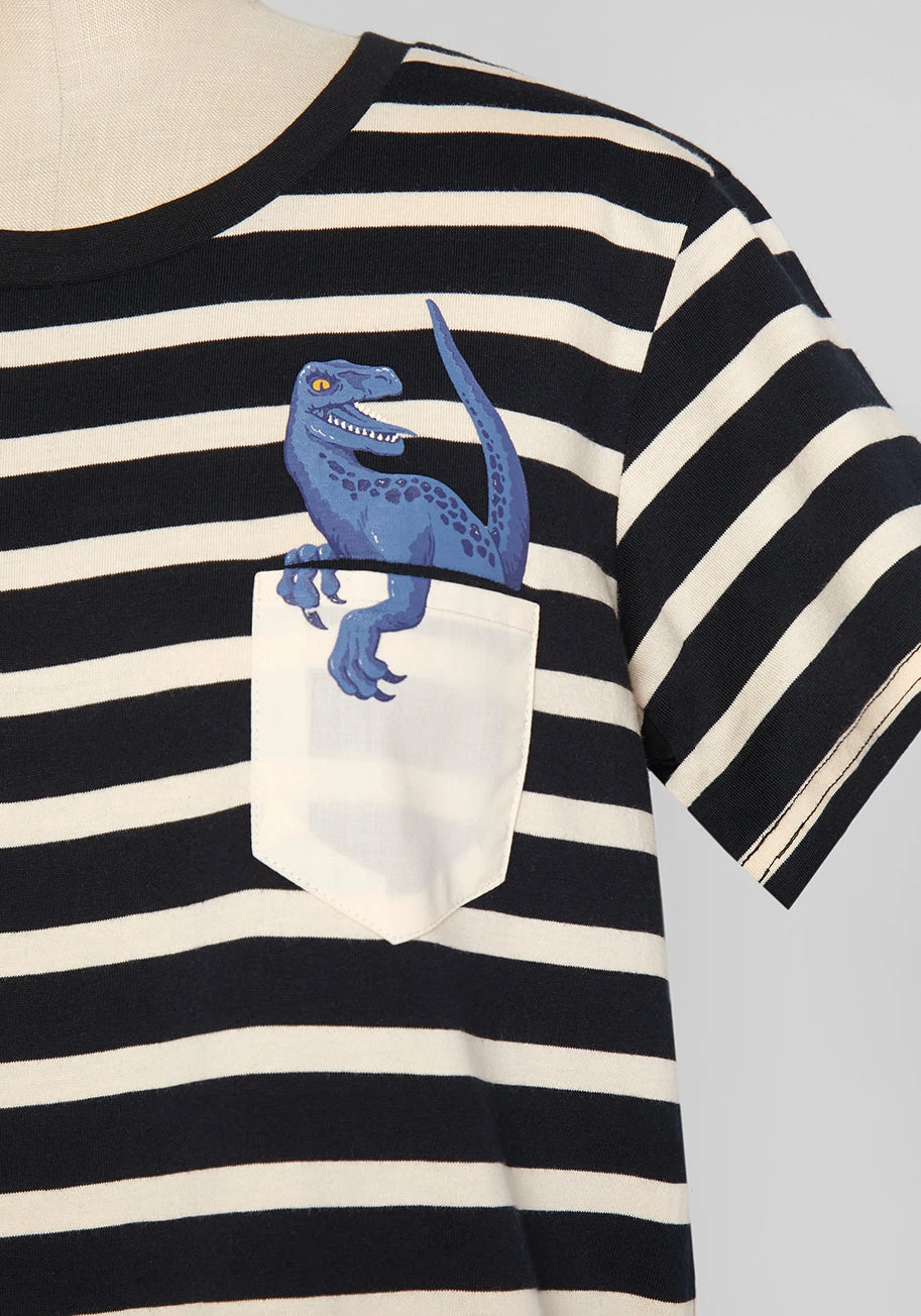 So unique and fiercely fun, you’re going to love the reactions you get whenever you wear this relaxed fit graphic tee from Aussie brand Dangerfield! Made from a soft and stretchy cotton jersey knit with all over black and cream stripes, this top boasts a cream-hued pocket that features a voracious blue velociraptor graphic print that appears to be popping out from within the pocket! This short sleeve crew neck T-shirt is loungeable, layerable, and will become a favorite in your collection of casuals.
