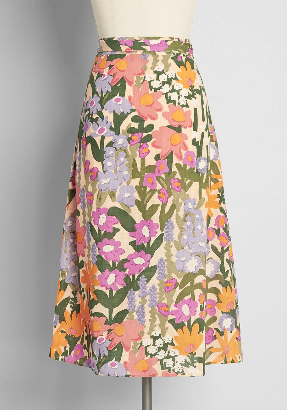 Inspired by vintage watercolor paintings, this cream-hued wrap skirt from Aussie brand Princess HIghway features an abundant burst of floral blooms in shades of orange, pink, and blue surrounded by lush greenery throughout. Made from a lightweight cotton weave, this retro-chic midi skirt boasts a high-rise waistline with adjustable tie-belt closure at the hip, and a stylish A-line silhouette.